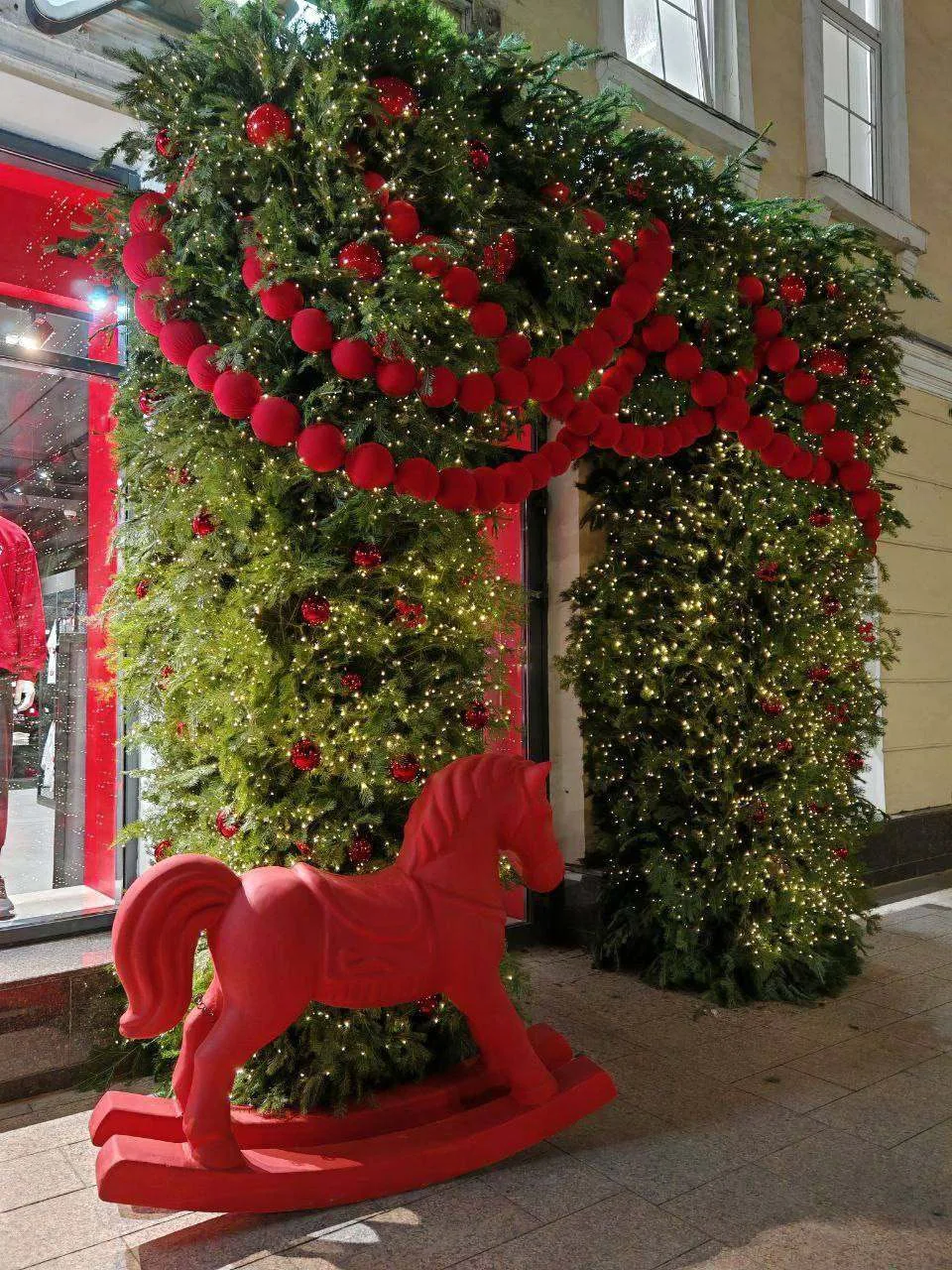 💬 У клиентского центра «Авангард» на ул. Ленина, 20 появилась красная лошадка‑качалка, а вход оформили еловыми ветками и бусами.