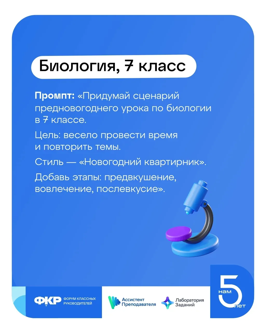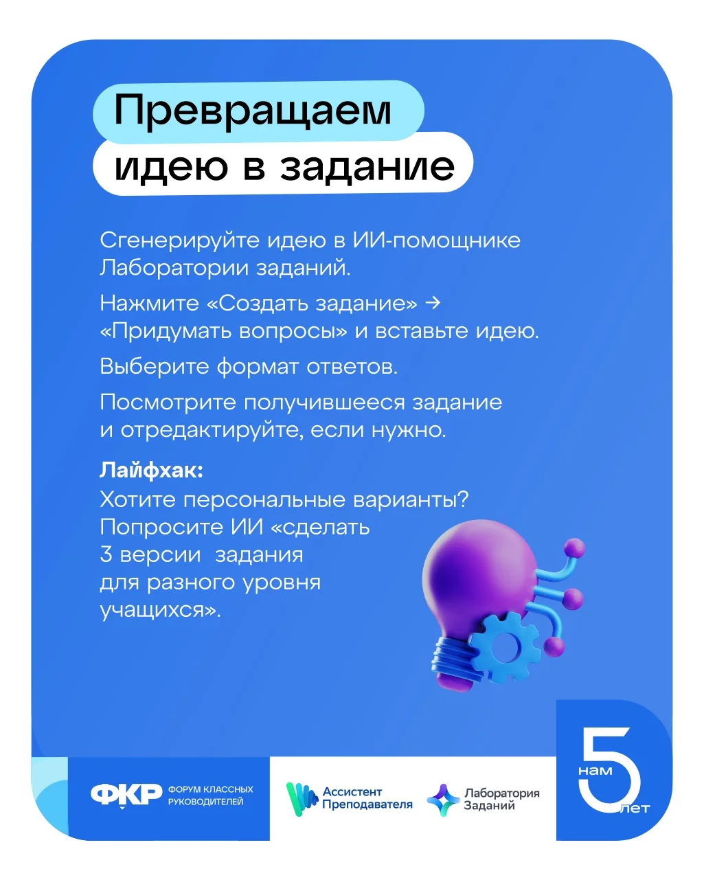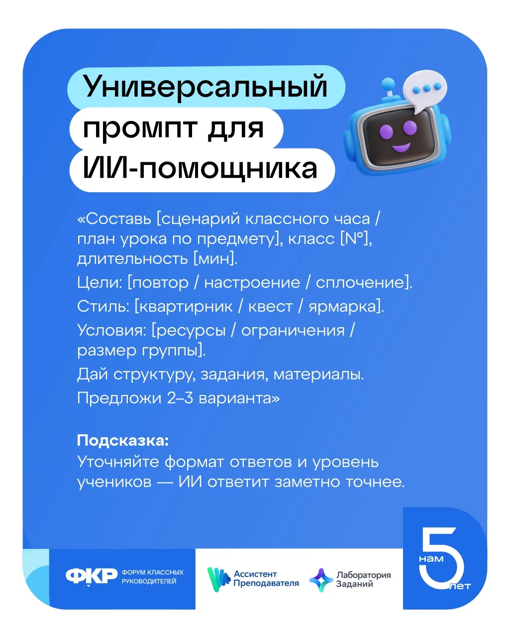 Вам поможет сервис «Ассистент преподавателя». Внутри есть Лаборатория заданий (vk.cc/cSaYEJ), в которой можно создавать планы уроков, сценарии классных часов, тексты за пару минут. Просто пишете промпт (запрос) встроенному ИИ-помощнику, получаете готовый сценарий, план, набор заданий.
