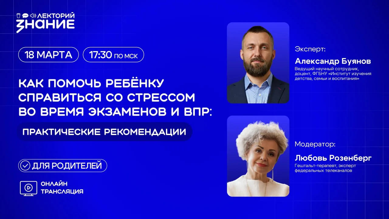 Российкое общество «Знание» приглашает эфир 18 марта в 17:30 мск. Поговорим о практических способах психологической поддержки детей в экзаменационный период.