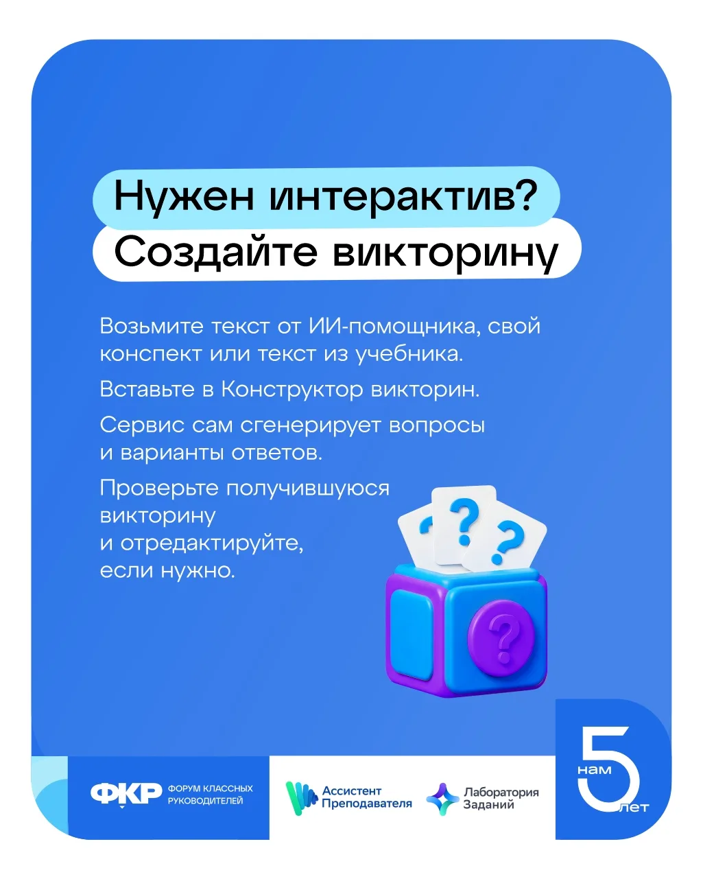А если хотите добавить интерактива — копируете текст от ИИ-помощника в Конструктор викторин (vk.cc/cL1Ai2). Он тоже есть в Ассистенте преподавателя и автоматически генерирует квиз. Вуаля, сэкономлено несколько часов подготовки!