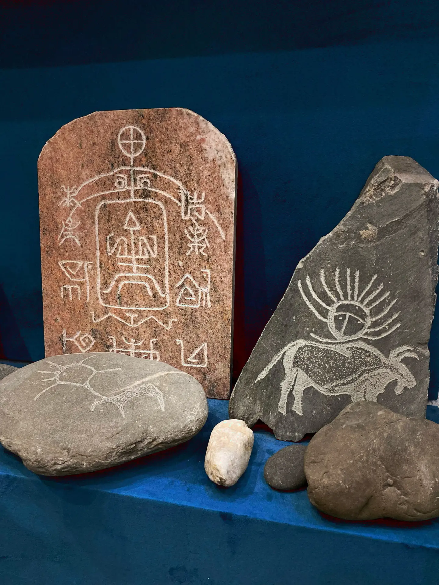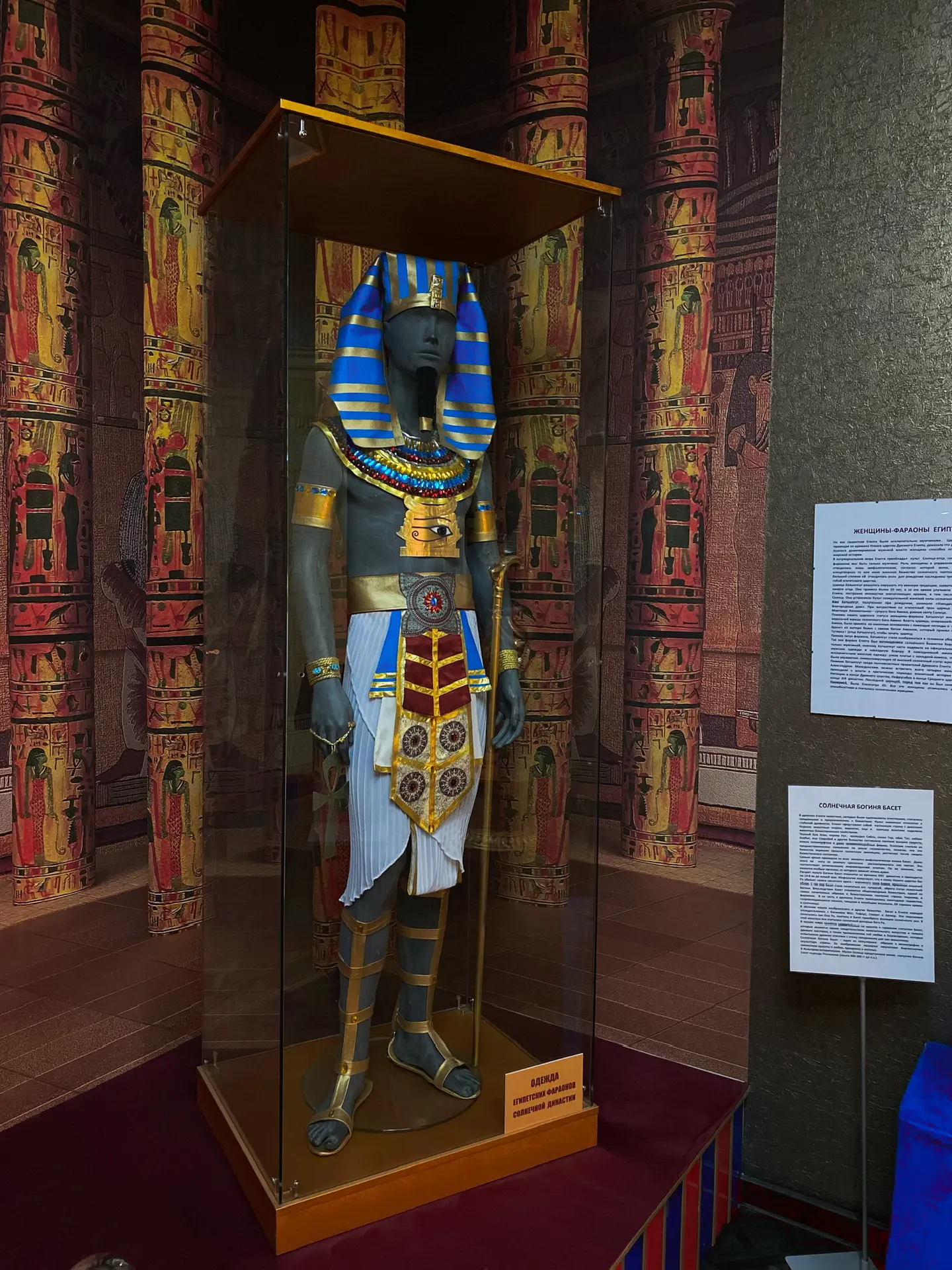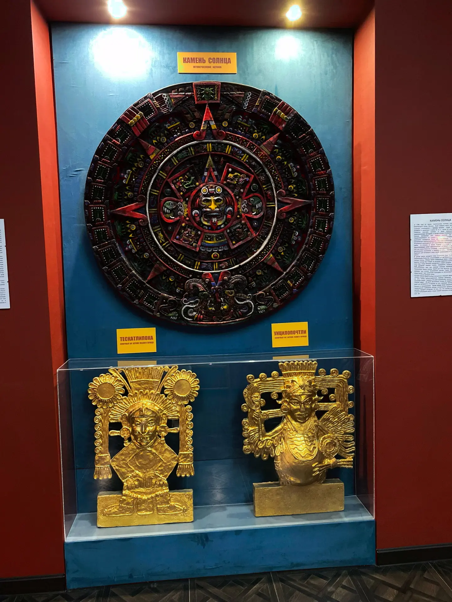 Можно увидеть копию трона Тутанхамона, зерцало русского воина XVI века, маски инков, наскальные рисунки с Алтая и даже коллекцию денежных купюр с изображением Солнца.