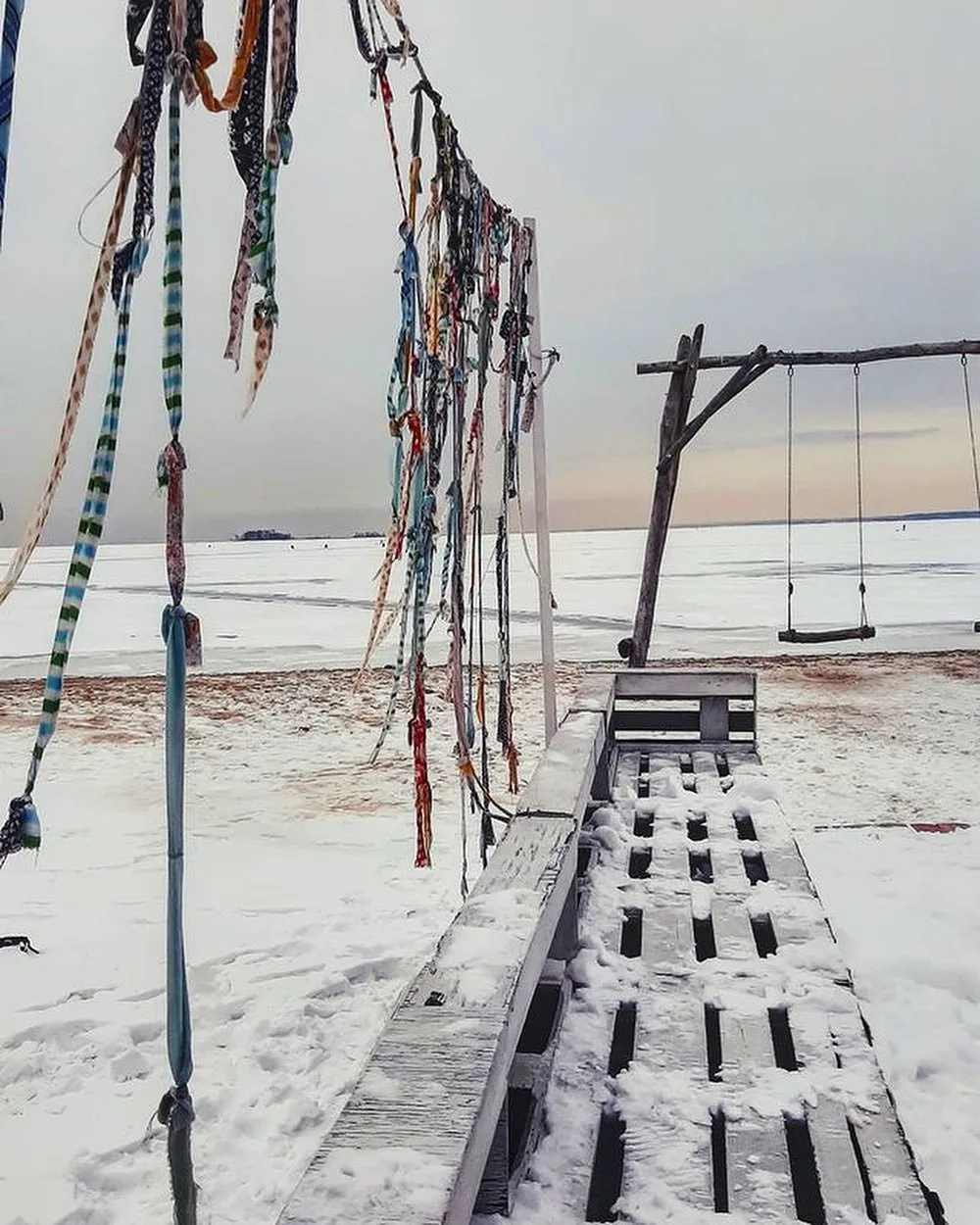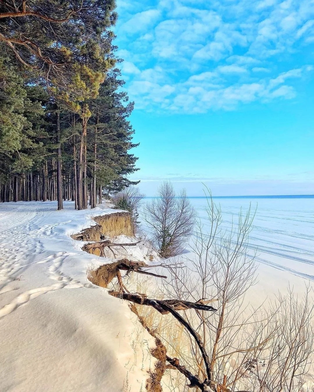 Ледовые узоры у берега Трещины, волны, отражения — просто гуляйте и ловите красоту.