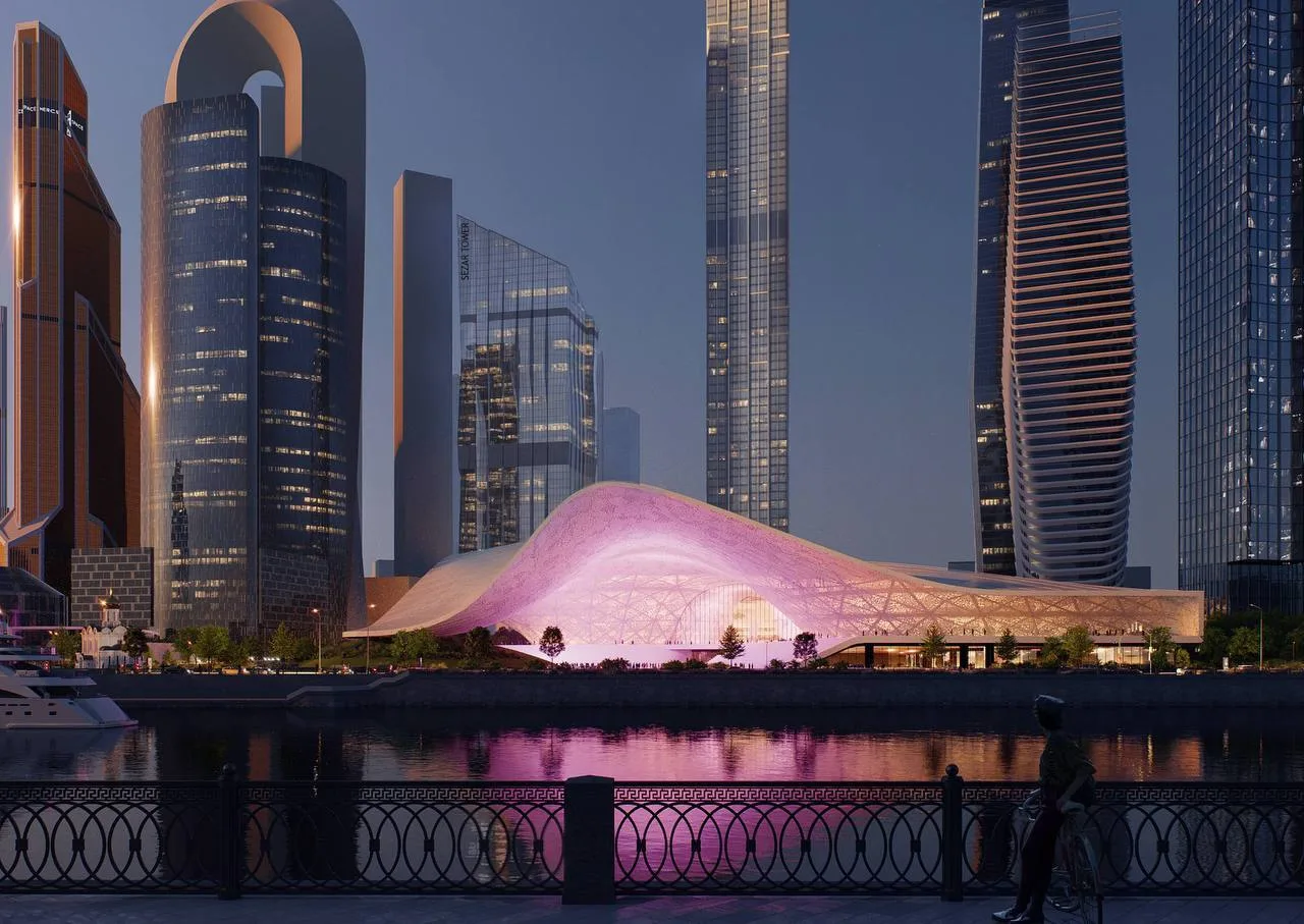 Здание будет оснащено самонесущей крышей размером примерно 60 тыс. кв. м и мультимедийным фасадом. Рядом появится ландшафтный парк с искусственными водоёмами. Внутренние помещения займут многофункциональные зоны, включая выставочные галереи, концертный зал, медиа- и пресс-центры, а также пространства для деловых встреч, нетворкинга и фудкортов.