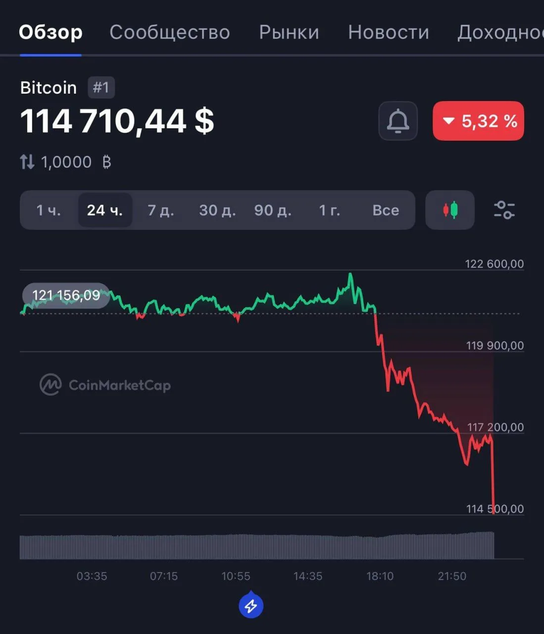 Bitcoin обваливается до $114,000 после ввода Трампом 100% экспортного тарифа против Китая.