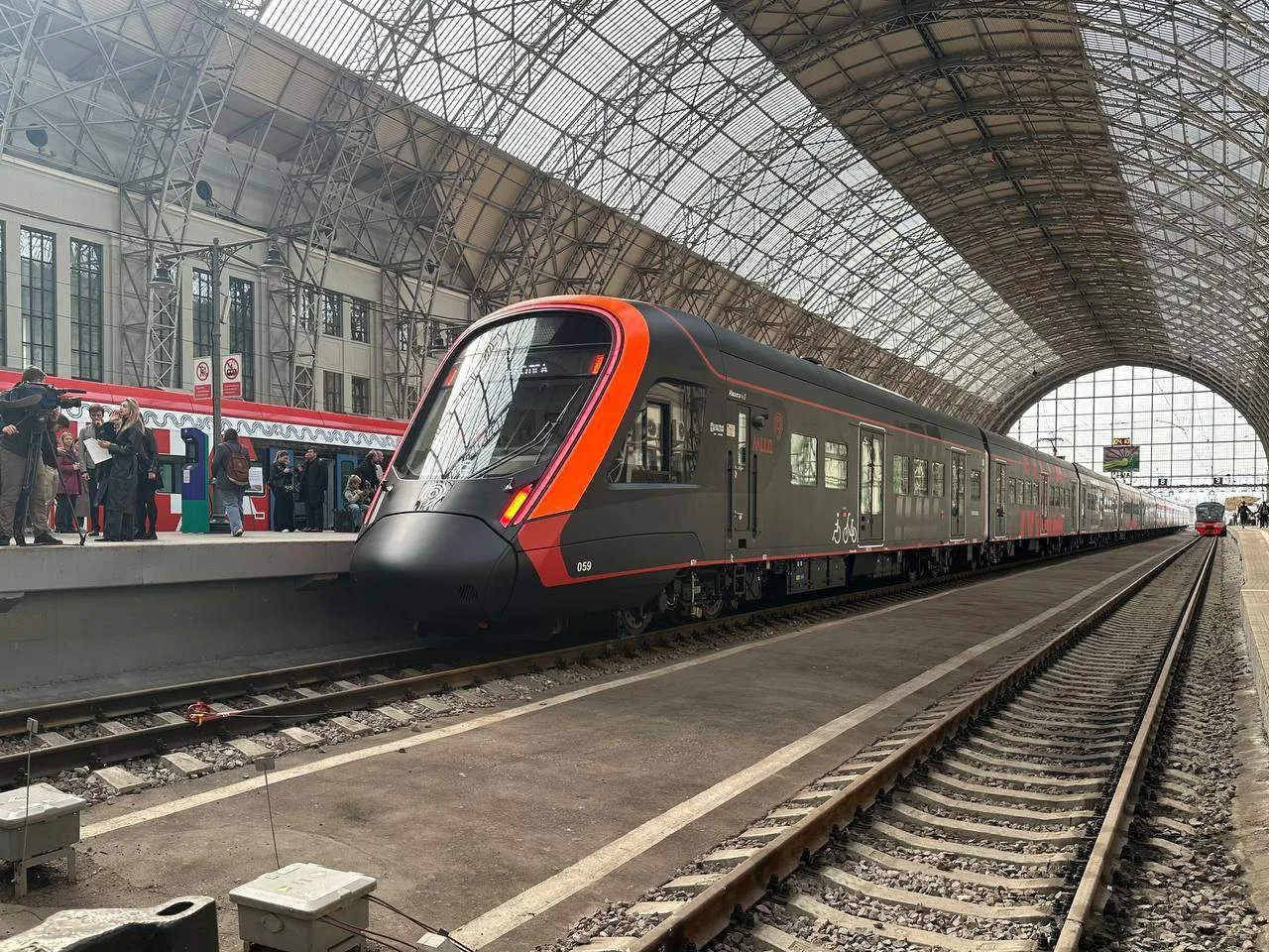 Это 100-й юбилейный поезд, который с сегодняшнего дня будет курсировать по линии МЦД-4. В салоне — мягкие кресла, широкие проходы и современная система климат-контроля.