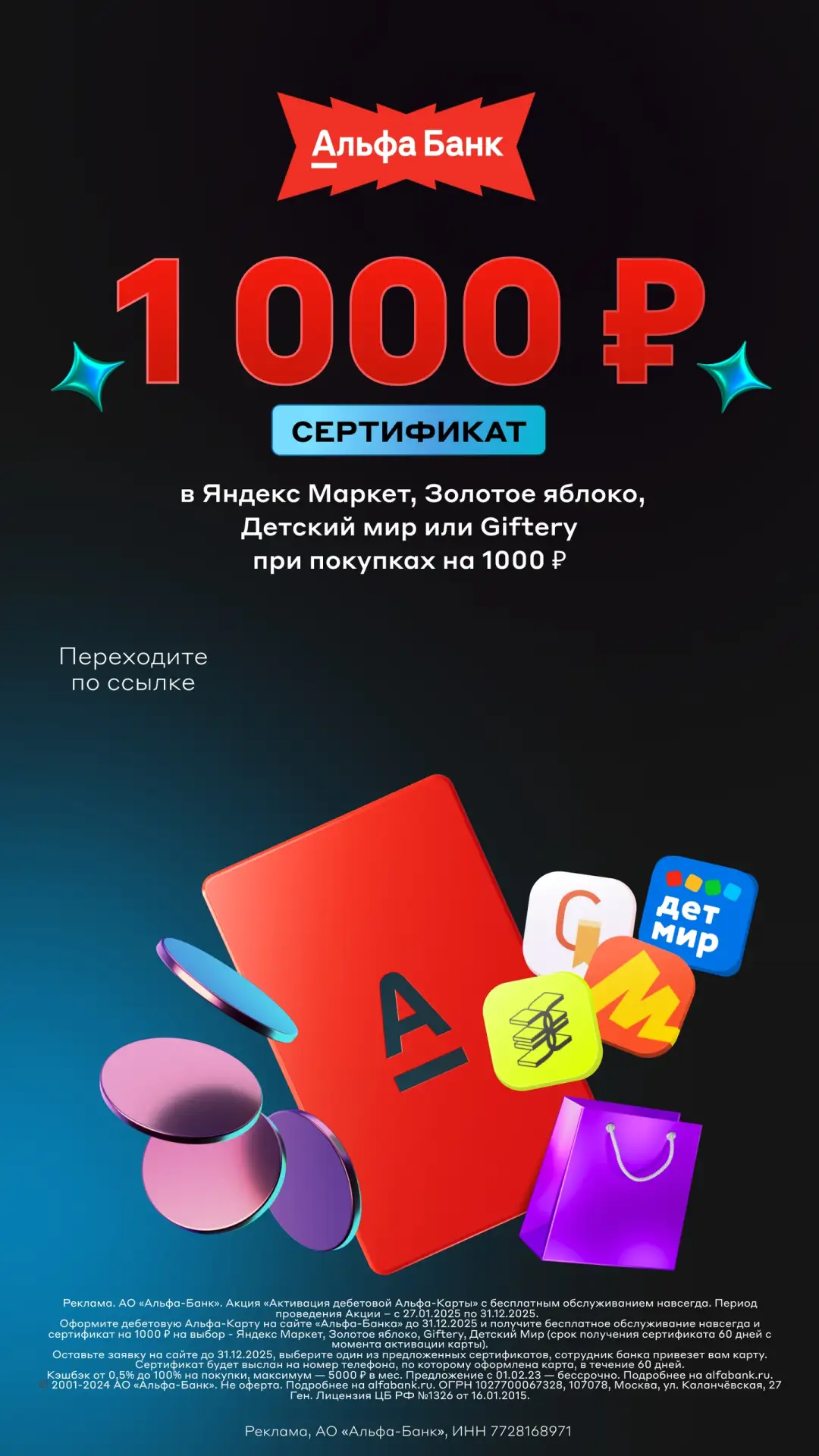 Также вы получите сертификат на 1000 ₽ при тратах от 1000 ₽ в Золотое Яблоко, Детский Мир, Яндекс Маркет или Giftery. А как приятный бонус — кэшбэк 1000 ₽ при покупках от 1000 ₽! Спешите оформить по ссылке! https://alfa1000ot3000.prfl.me/victimblood/1kd9ia?erid=2VtzqvSX9s7