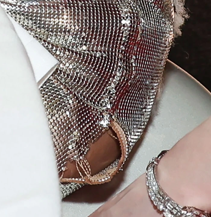 Почему лопнуло платье Кайли Дженнер и как она выкрутилась. Все просто: платье разошлось по боковому шву на левом бедре. Если сесть, именно там будет зона максимального натяжения. Вот винтажные нити и не выдержали.