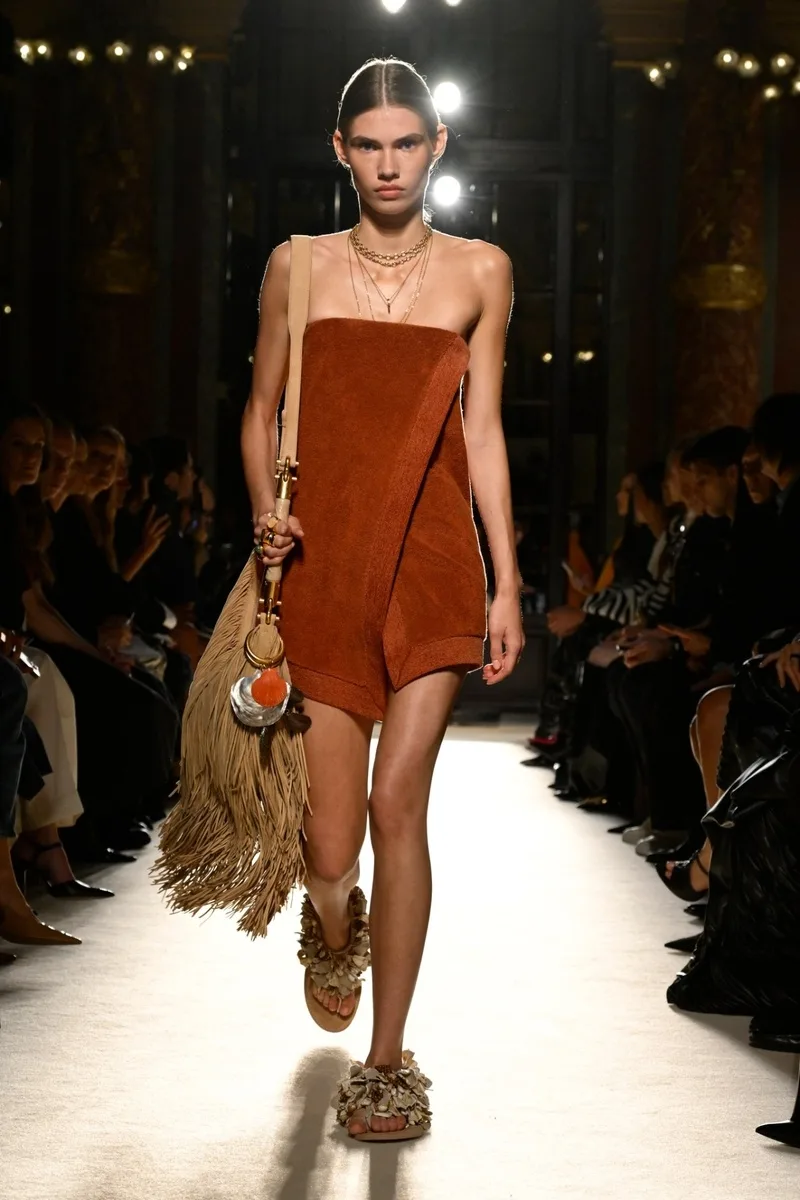 Оливье Рустен посвятил всю свою весеннюю коллекцию Balmain морскому побережью: платье без бретелек, напоминающее обернутое вокруг туловища полотенце после купания, ансамбли из макраме с длинной бахромой и ракушки, звенящие на одежде, обуви и сумках.