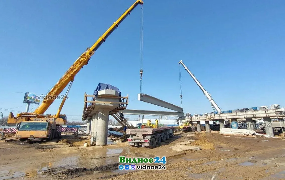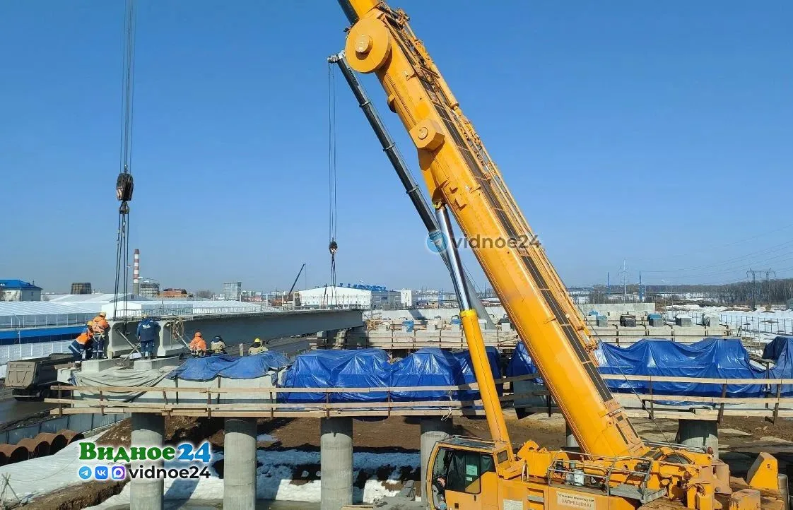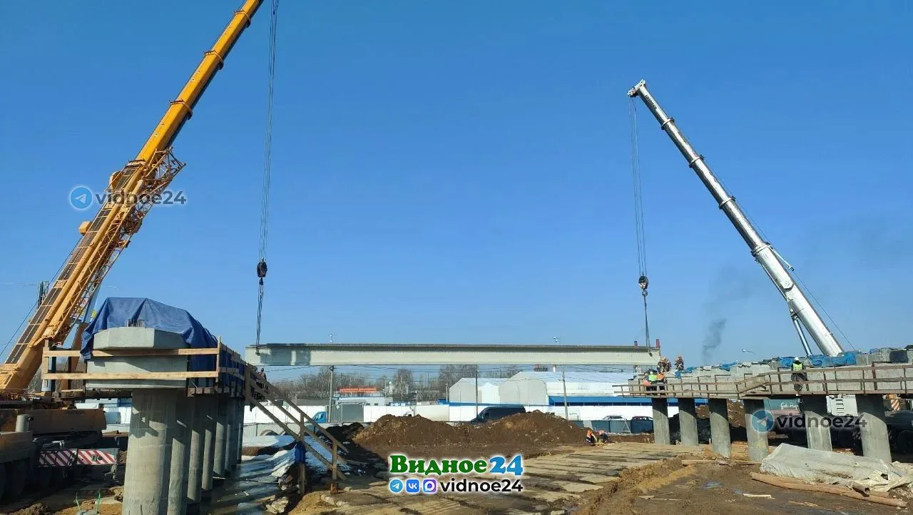 На пересечении Белокаменного и Каширского шоссе начался монтаж главных балок железобетонного пролетного строения. Длина каждой балки 33 метра, вес – 60 тонн, их устанавливают два тяжёлых крана грузоподъемностью 200 тонн.