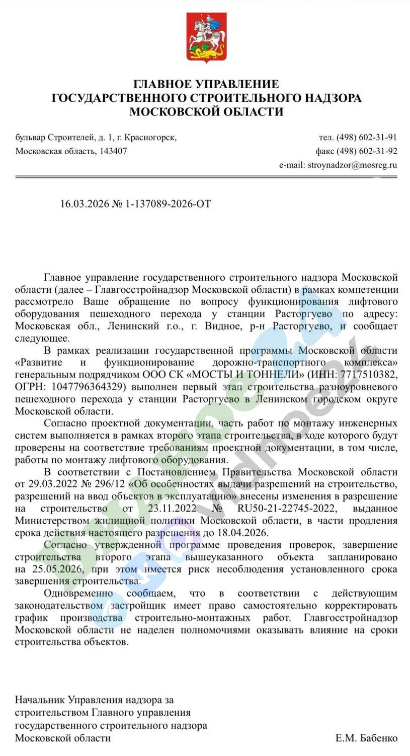 Главное управление государственного строительного надзора Московской области ответило на обращение жителя города Видное по вопросу неработающих лифтов на пешеходном мосту через железнодорожную станцию Расторгуево.