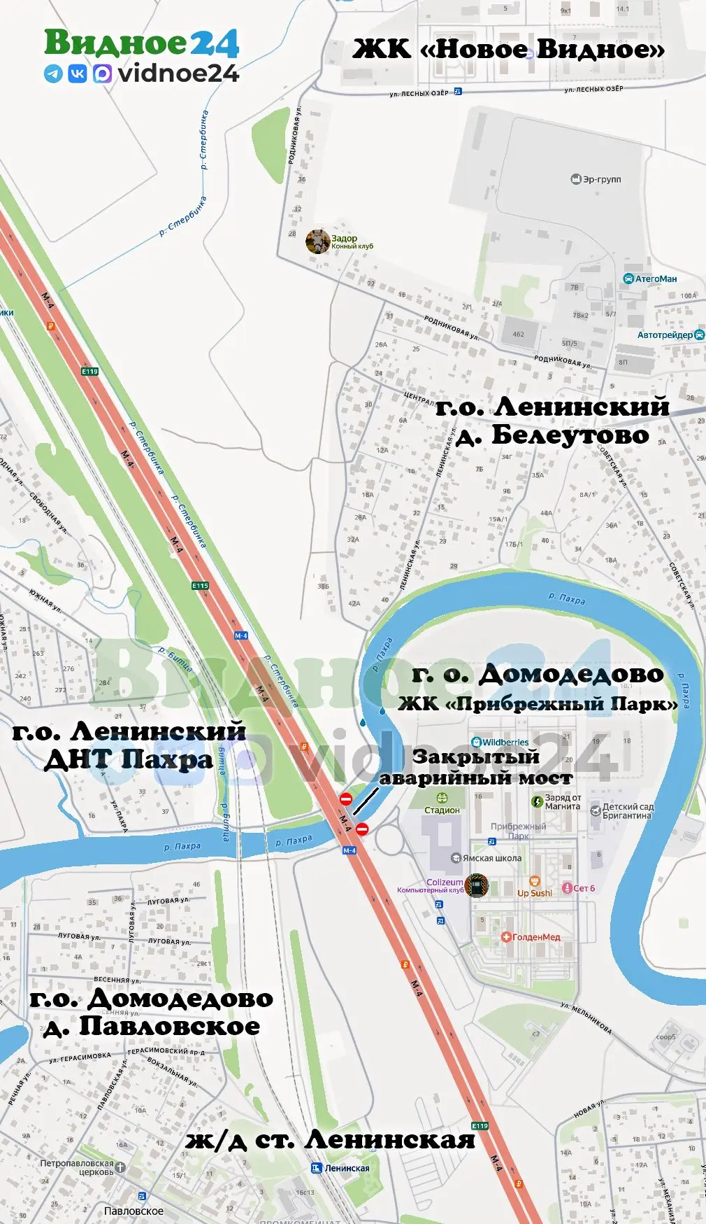 В связи с появившейся в СМИ информацией сообщаем: мост через реку Пахра в районе М-4 остаётся закрытым для движения транспорта и пешеходов.