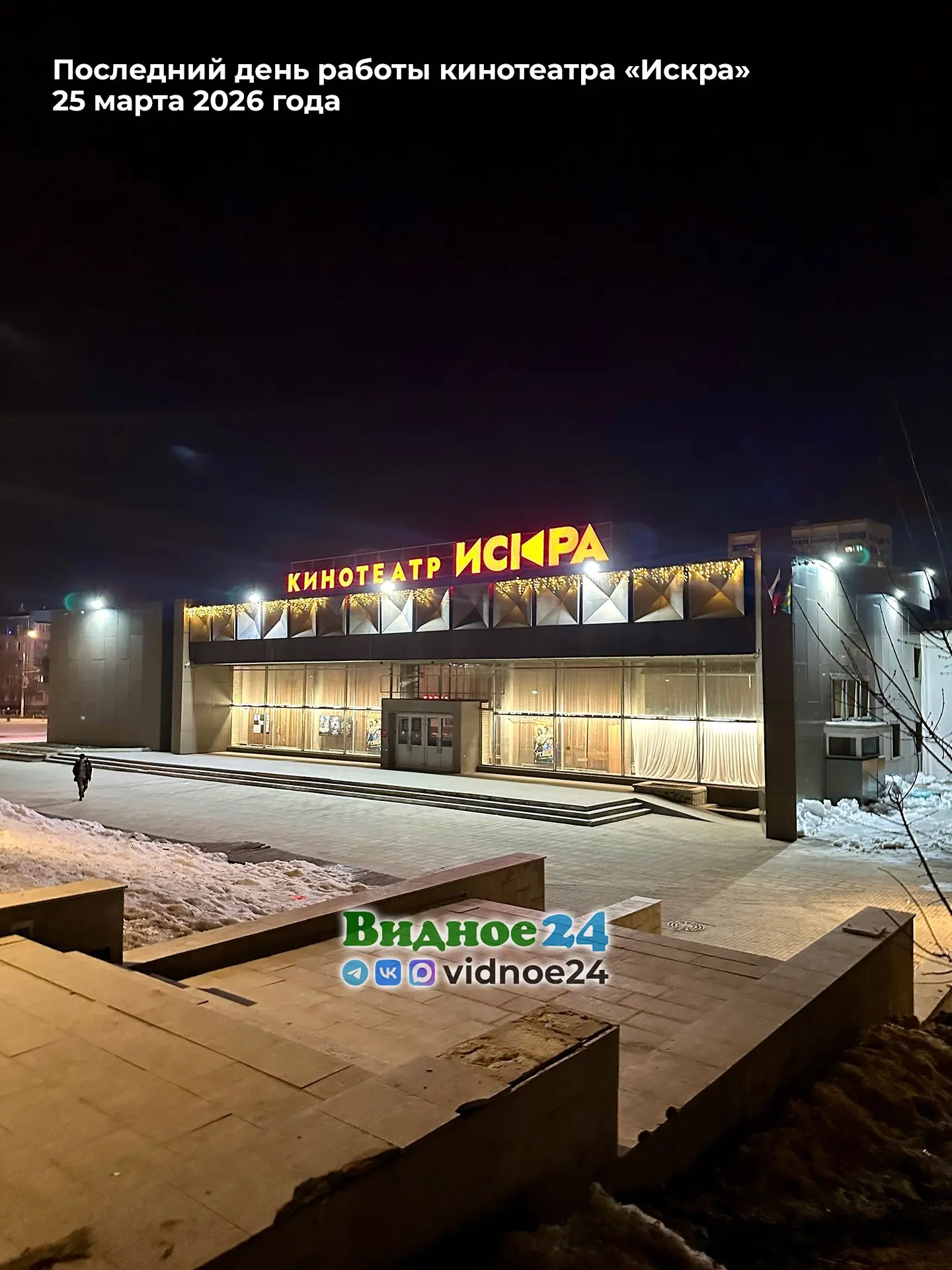 Вчера, 25 марта 2026 года, был последний день работы кинотеатра «Искра» на Советском проезде города Видное. В дальнейшем здание кинотеатра перепрофилируют в молодежный центр наподобие того, как это было сделано в городе Домодедово.