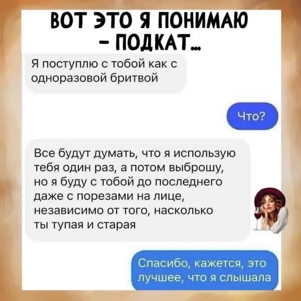 Пока внутреннюю бабку удаётся сдерживать, но она тебе: - «Скажи этой дуре проститутской, что ей ещё рожать и что не май месяц!» и однажды рот всё скажет сам.
