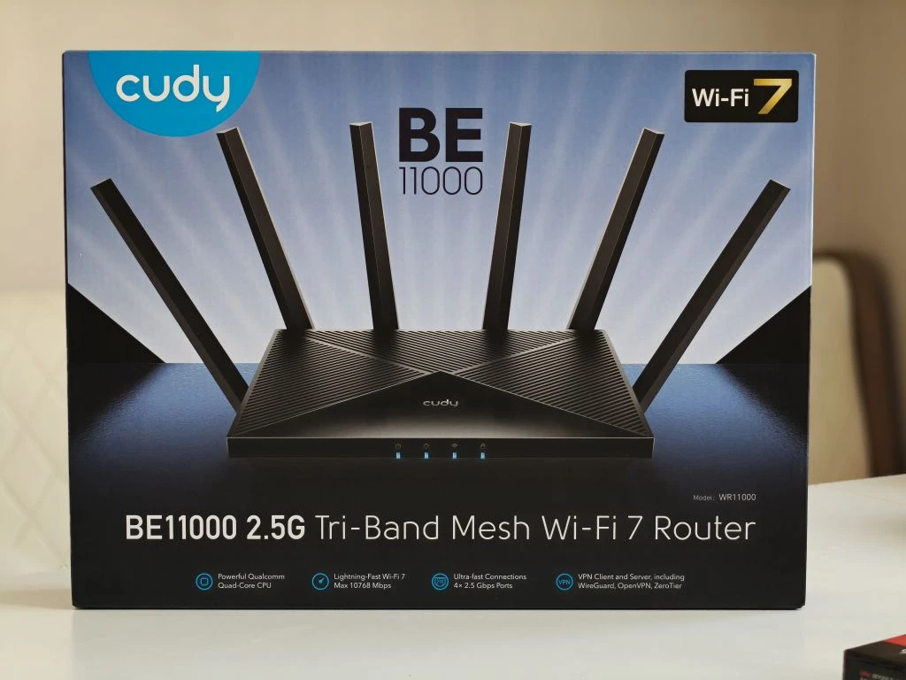 Приехал на опыты трехдиапазонный роутер Cudy BE11000. У него есть поддержка 6 ГГц с одной занятной оговоркой, которую изучу в процессе. А еще там 4 порта со скоростью 2.5 Гбит/с.