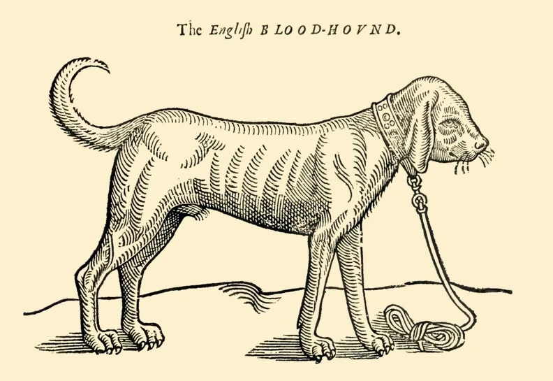 Бладхаунд на гравюре из книги "История четвероногих тварей и гадов" (The History of Four-Footed Beasts and Serpents, Edward Topsell), издания 1658 года.