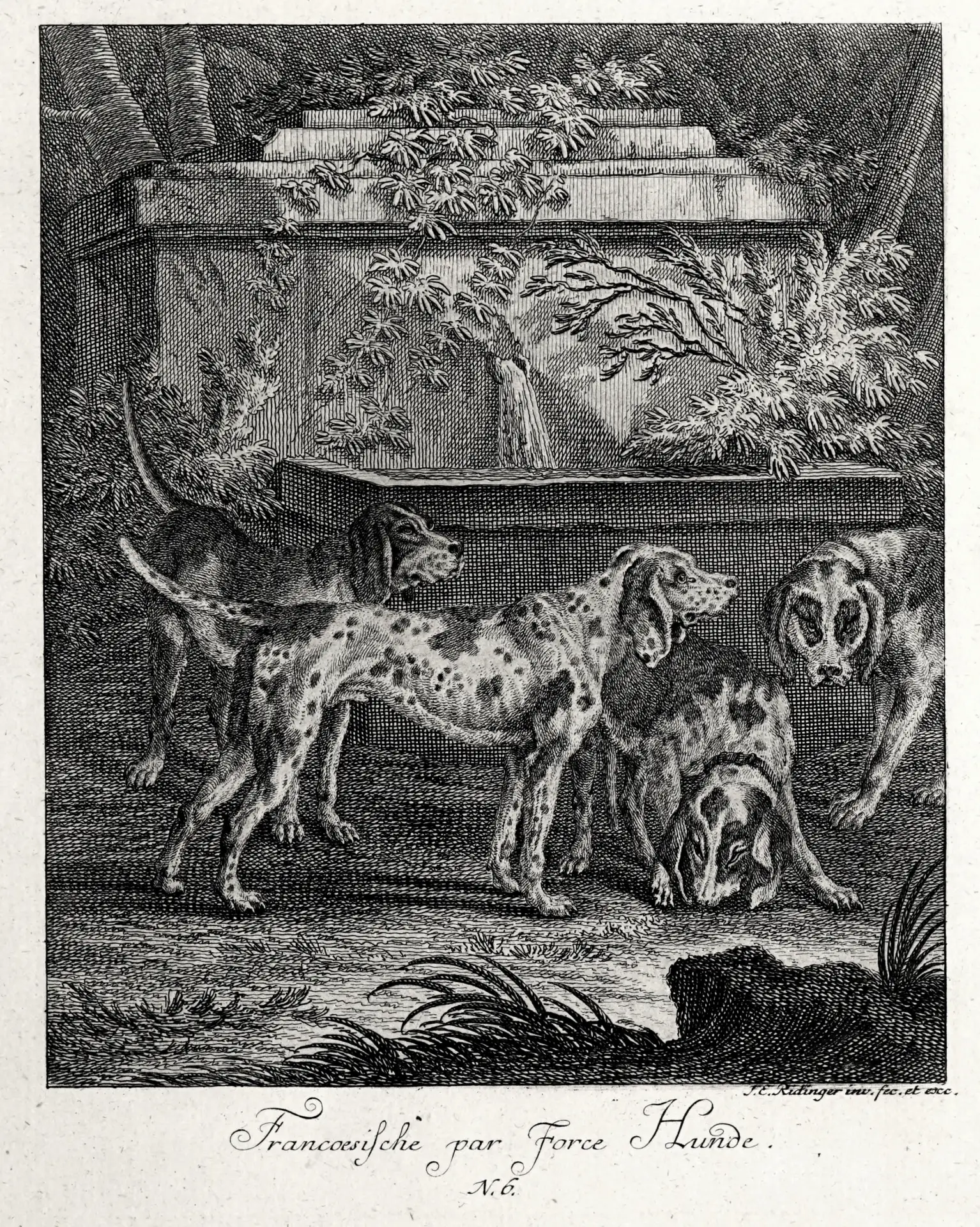 Французские собаки для парфорсной охоты (загон зверя до полного изнеможения). Johann Elias Ridinger (1698-1767), немецкий художник.