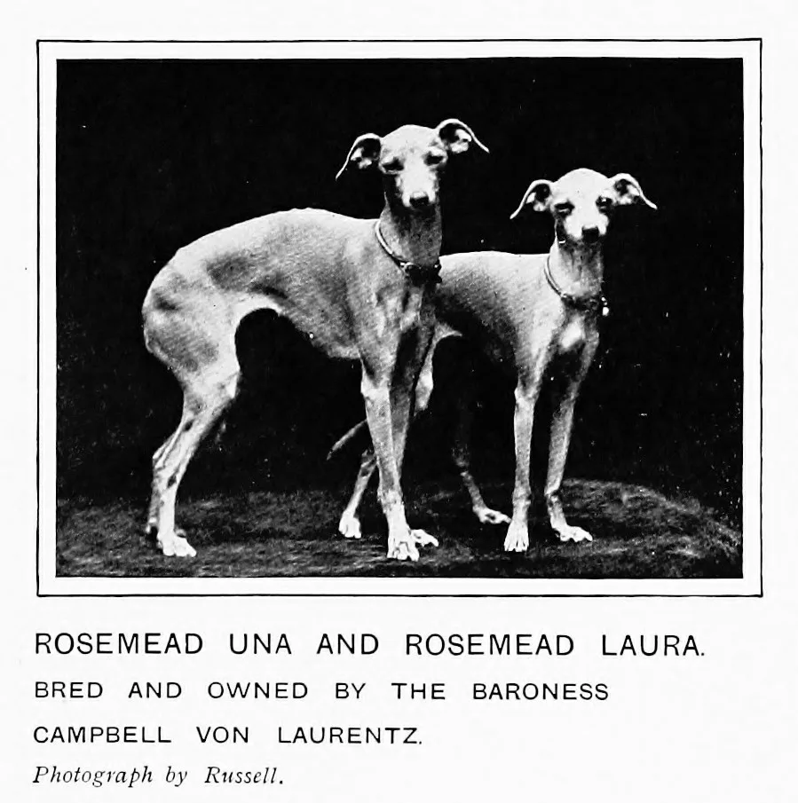 Rosemead Una и Rosemead Laura. Заводчик и владелец баронесса Campbell von Laurentz. Иллюстрация из книги "Новая книга о собаке", Robert Leighton, 1911 год. #борзая #левретка