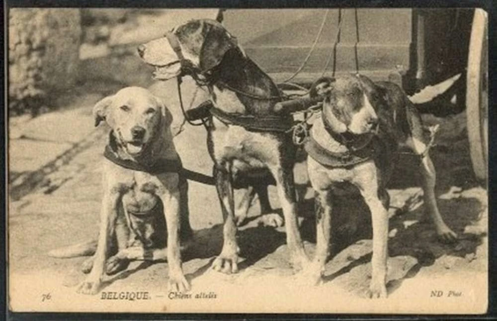 Собаки молочника впряженные в его тележку. Открытка, конец 19-го - начало 20-го века.
