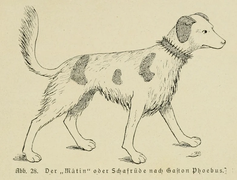 "Mâtin" (мастиф) или крупная овечья собака из книги Gaston Fébus. Гастон Феб - французский военачальник времен столетней войны, страстный охотник, автор "Трактата об охоте". Иллюстрация из книги 1921-го года издания "Немецкая овчарка в описаниях и изображениях" Макса фон Штефаница.