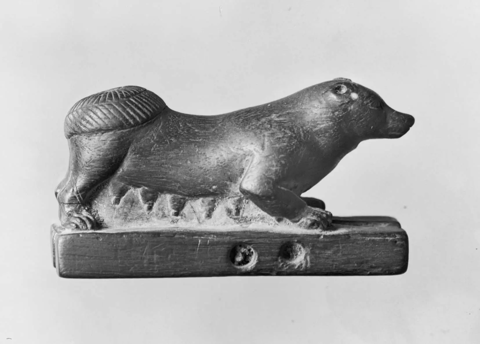 Эбеновое дерево. Египет, Новое царство, 16-13 века до н.э. Свернутый хвост собаки лежит на спине, изначально игрушка имела движущиеся челюсти.
