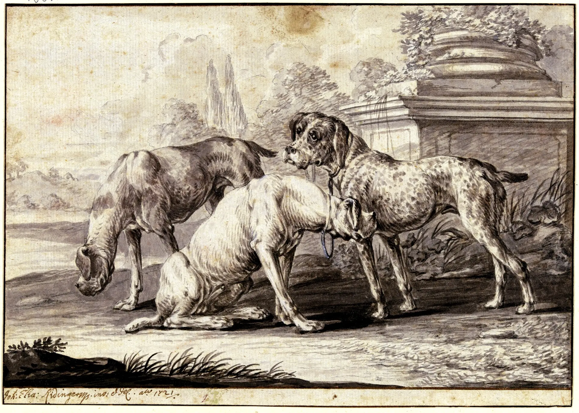 Три охотничьих собаки. Johann Elias Ridinger (1698-1767), немецкий художник.