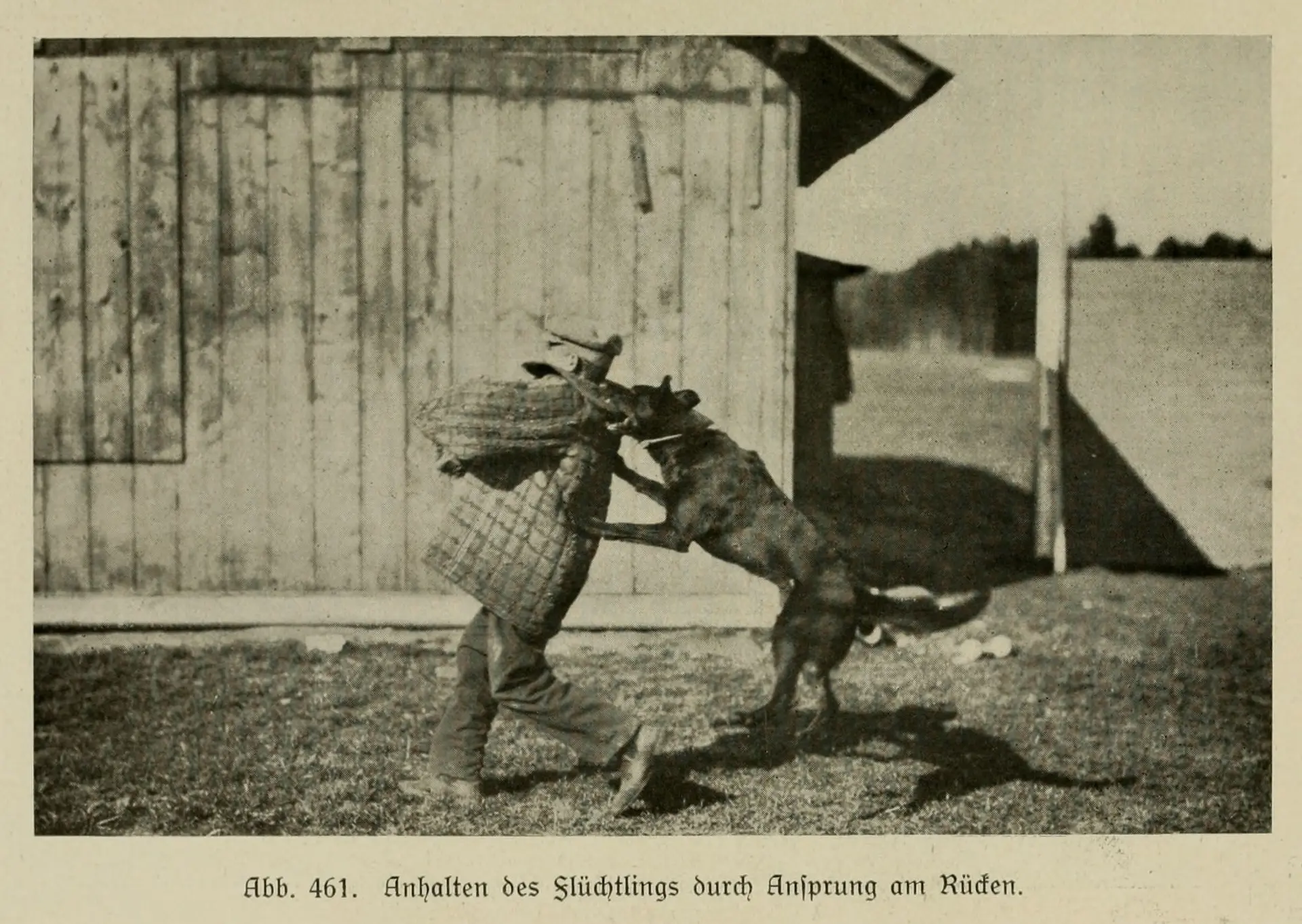 Остановка убегающего прыжком на спину. Иллюстрация из книги 1921-го года издания "Немецкая овчарка в описаниях и изображениях" Макса фон Штефаница.