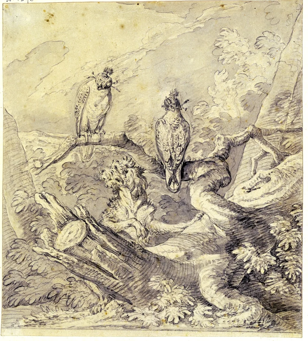 Охотничьи соколы и кокер-спаниель. Johann Elias Ridinger (1698-1767), немецкий художник. #кокер_спаниель #спаниель