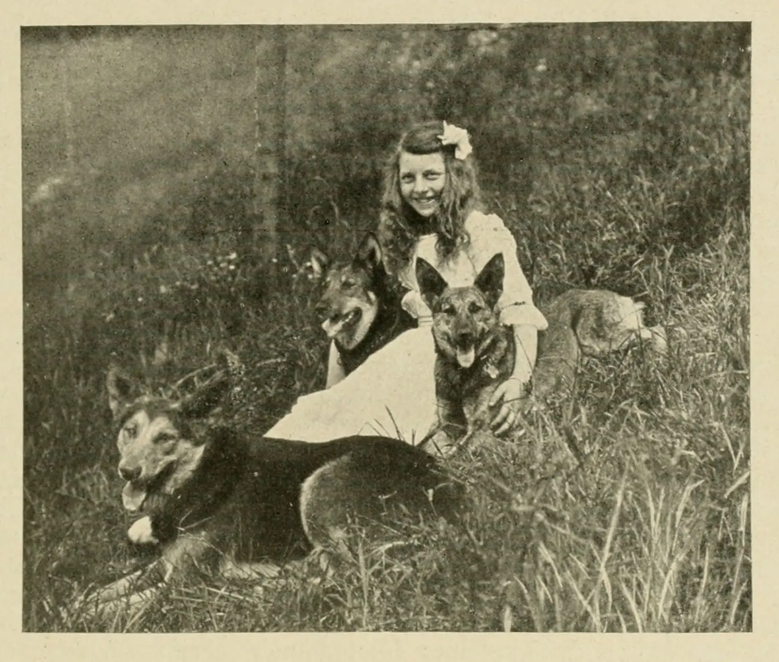 Группа обученных сторожевых собак. Иллюстрация из книги "Британские военные собаки, их дрессировка и психология". Автор Эдвин Ричардсон (Edwin Hautonville Richardson), начальник Британской школы дрессировки военных собак. Издана в 1920-м году в Лондоне.
