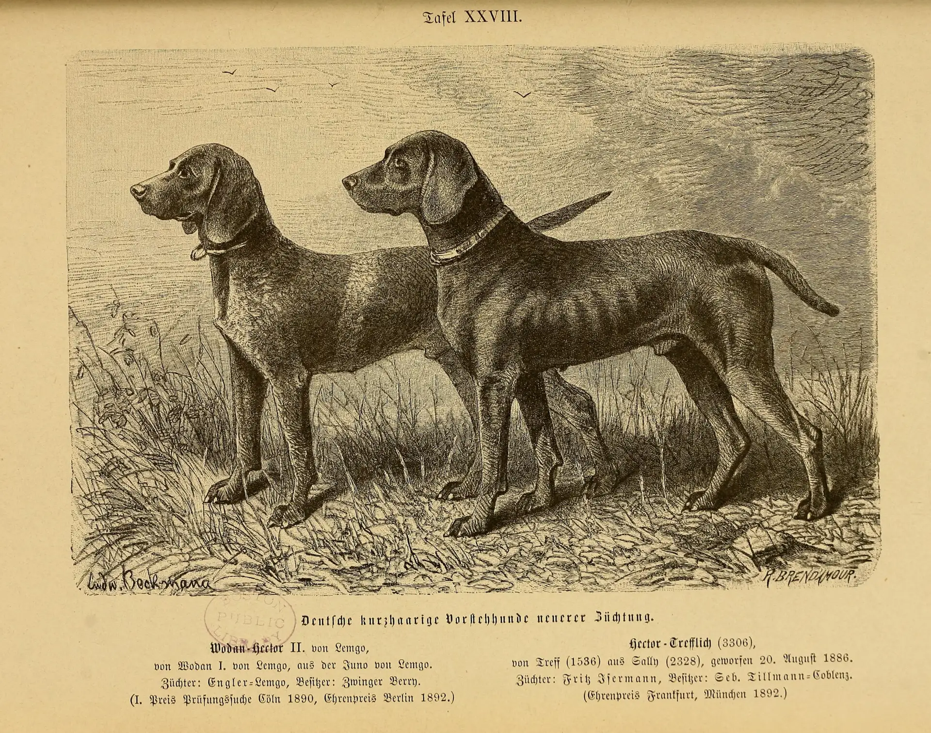 Немецкие короткошерстные легавые нового направления. Wodan-Hector II. von Lemgo, Wodan I von Lemgo x Juno von Lemgo. Заводчик Engler (Лемго), владелец: Zwinger Berry. Первое место в Кёльне, 1890 год, почетный приз в Берлине, 1892 год. Hector - Crefflich (3306), Treff (1536) x Sally (2328), родился 20 августа 1886года. Заводчик: Fritz Isermann, владелец: Seb. Tillmann (Кобленц). Почетная премия во Франкфурте и Мюнхене в 1892 году. Иллюстрация Ludwig Beckmann из книги Geschichte und Beschreibung der Rassen des hundes (Описание и история пород собак), 1894.