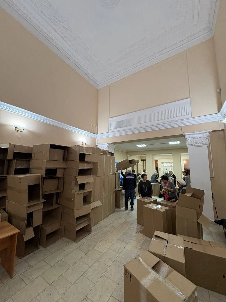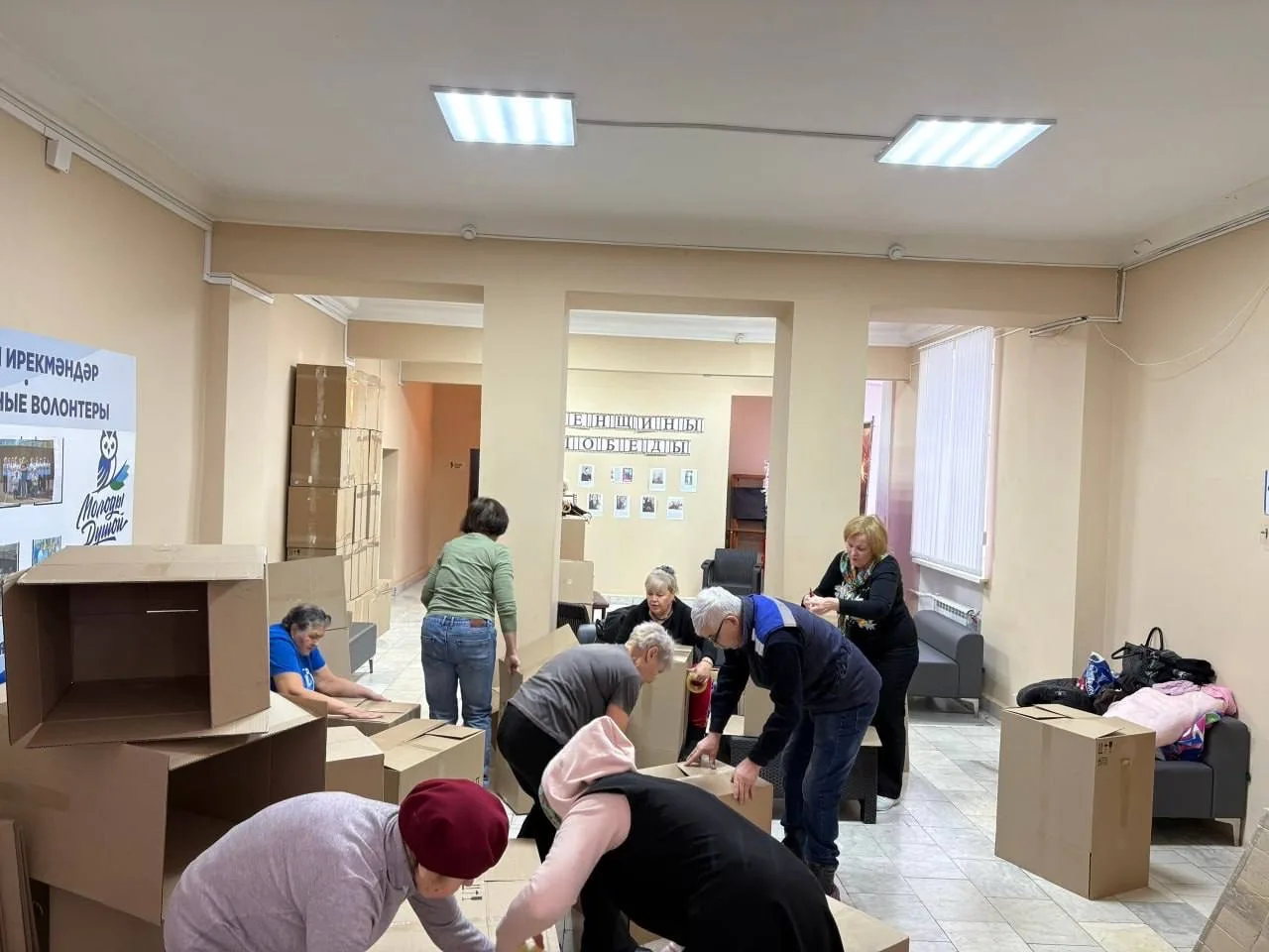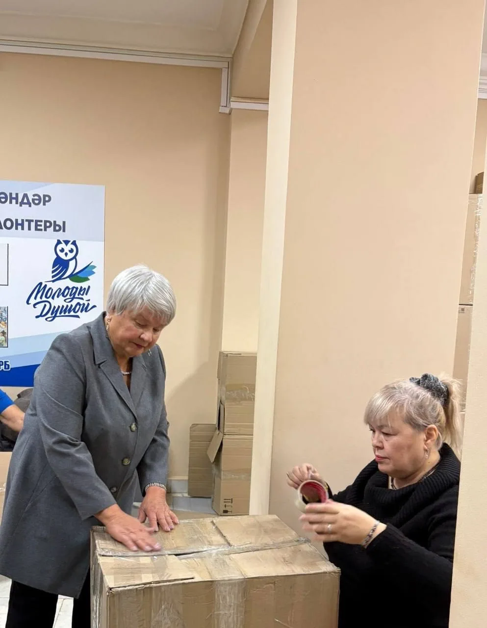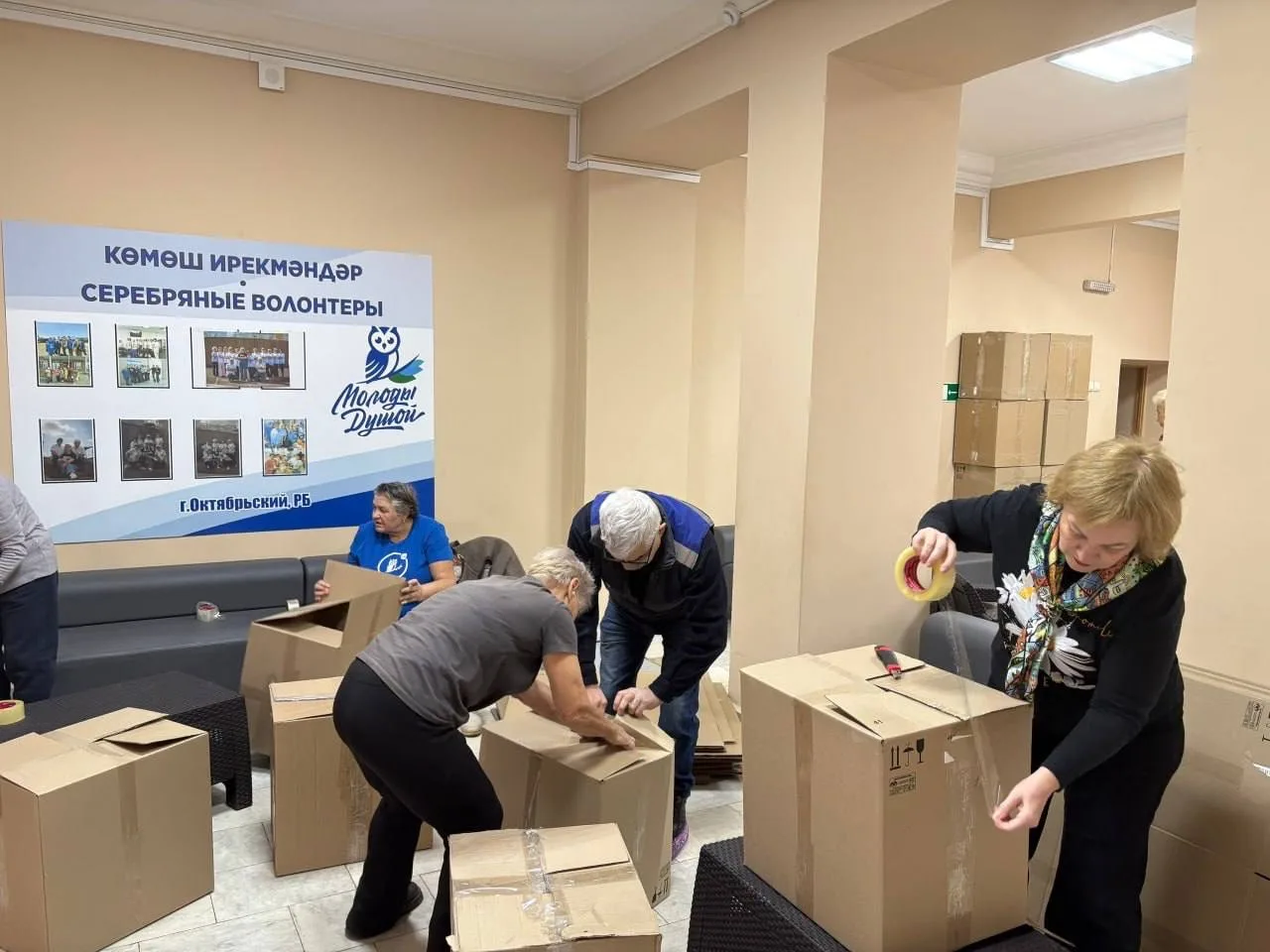 Серебряные волонтёры помогли собрать коробки. Студенты Октябрьского нефтяного колледжа также активно включились в процесс подготовки груза к отправке.
