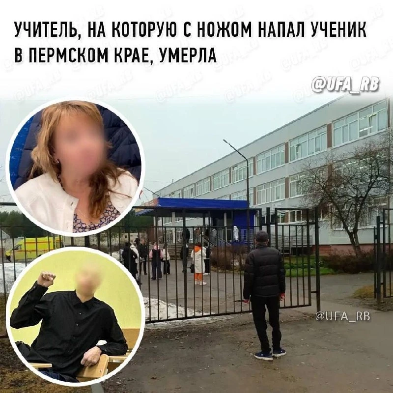 17-летний подросток ударил ножом учителя у входа в школу №5 в Добрянке в Пермском крае. ЧП произошло сегодня утром.. Его задержали. Учительница умерла.