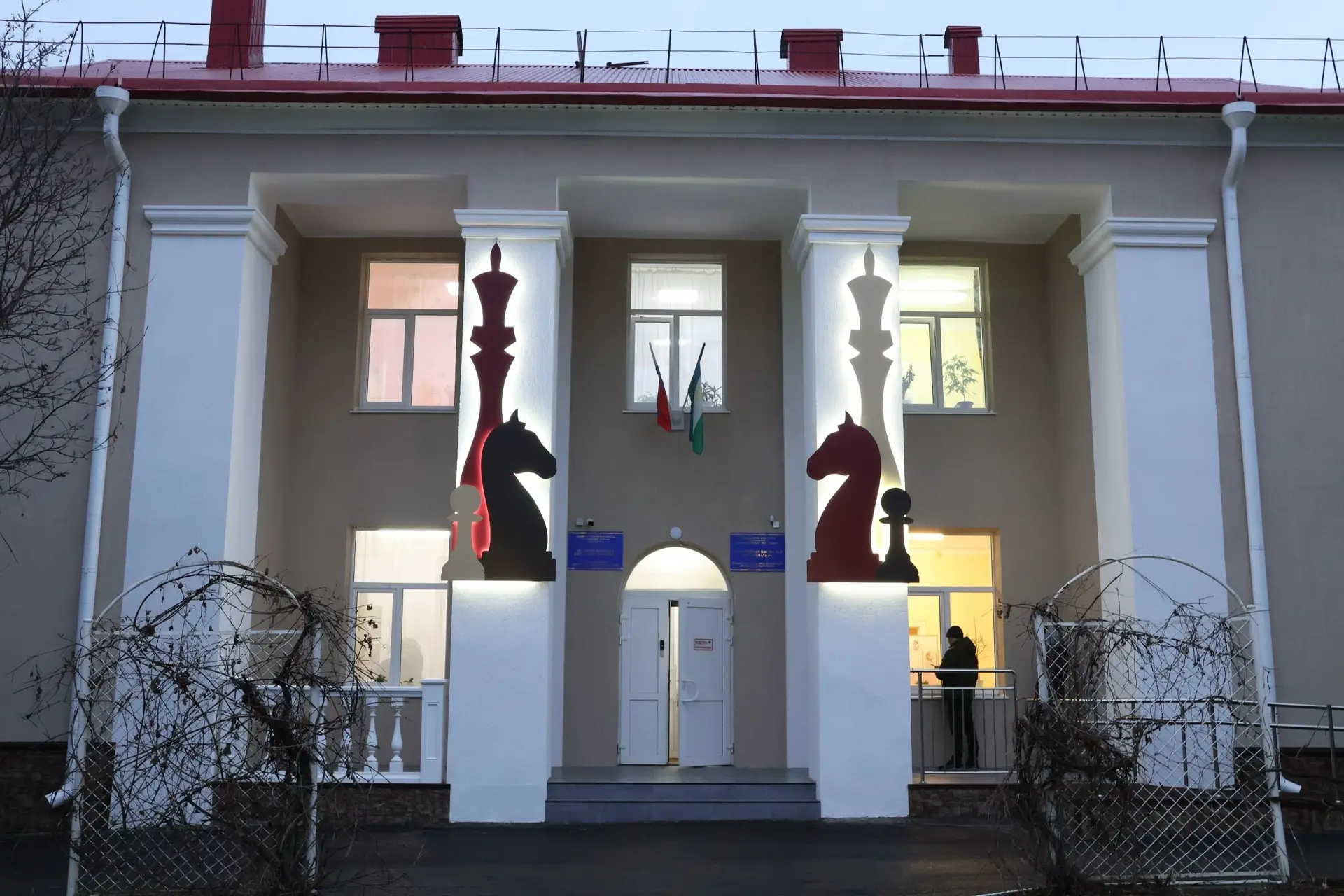 В ходе ремонта заменили старые деревянные окна на пластиковые, установили пандусы, обновили крыльцо и создали новую современную входную группу, утеплили фасад. На нём теперь красуются шахматные фигуры с подсветкой, которые придают зданию уникальный облик и подчёркивают его предназначение.