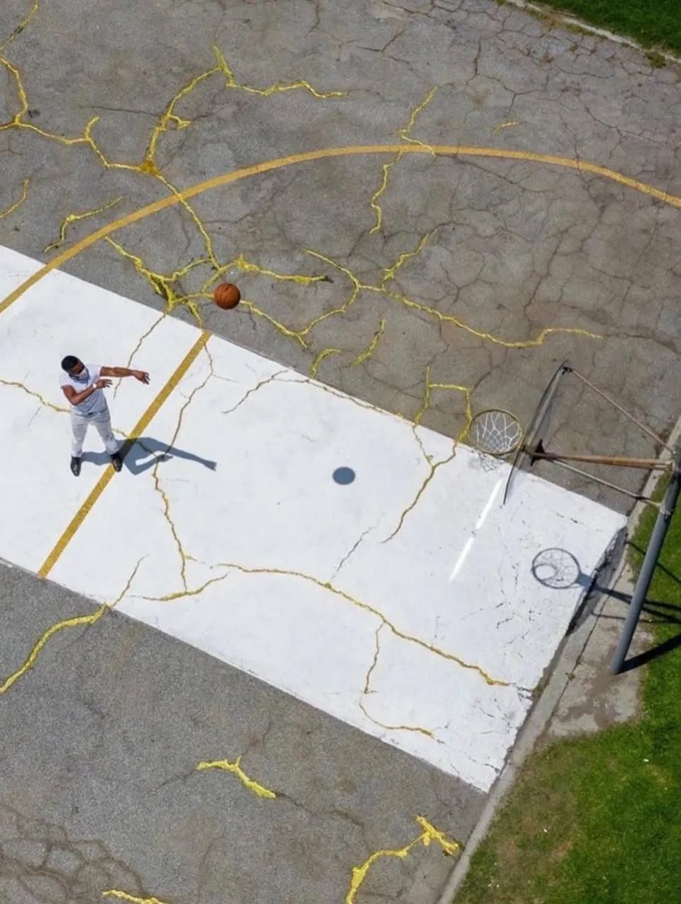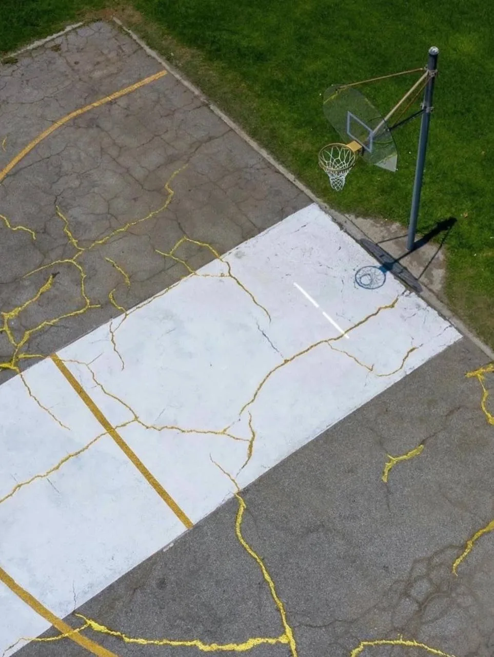 🇺🇸 Вдохновившись этим направлением, художник Виктор Соломон (Victor Solomon) во время пандемии восстановил заброшенную баскетбольную площадку в Южном LA, залив трещины смолой с золотым пигментом.