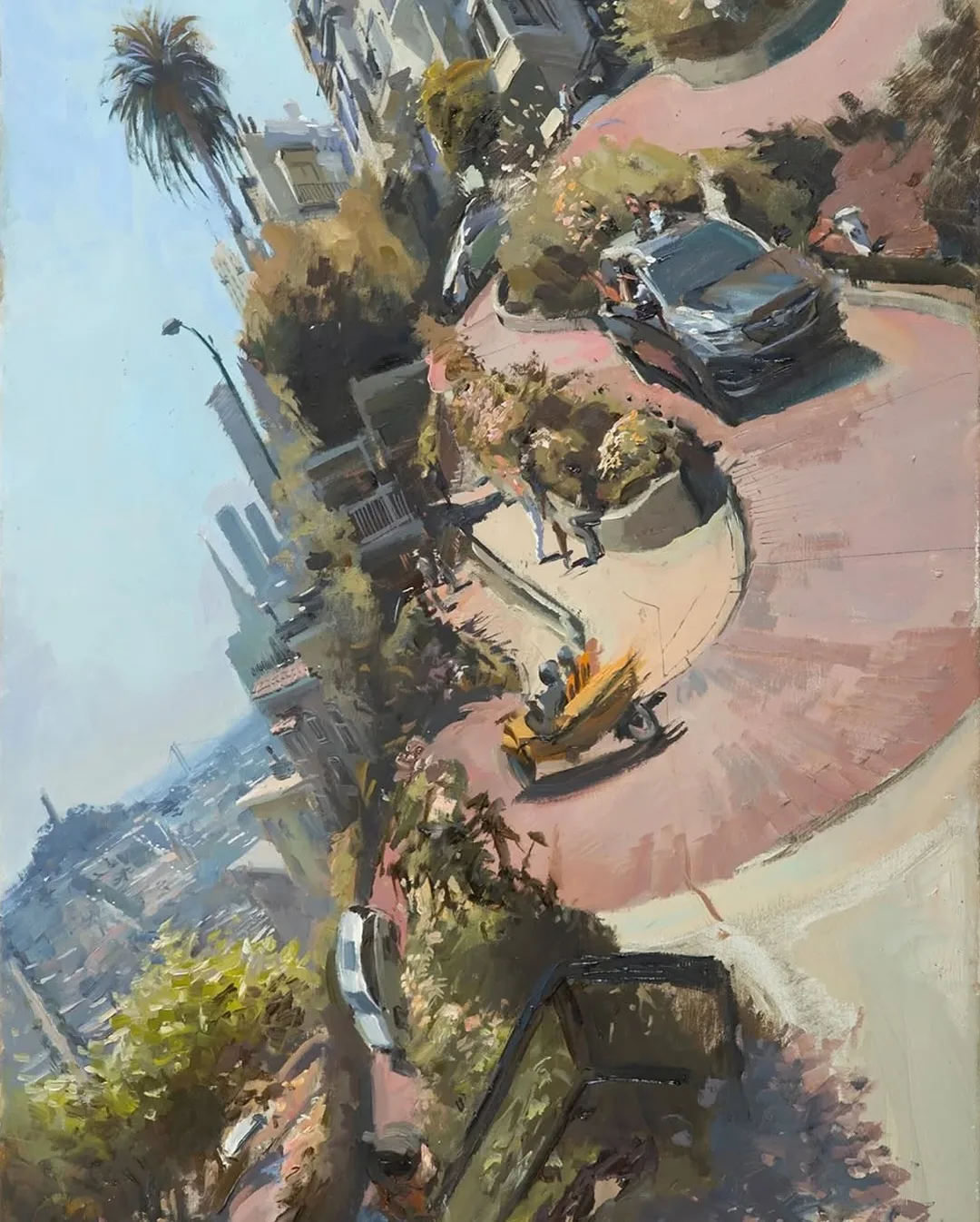 Рисует он полностью на пленэре - ставит мольберт прямо посреди улицы и старается запечатлеть течение жизни.