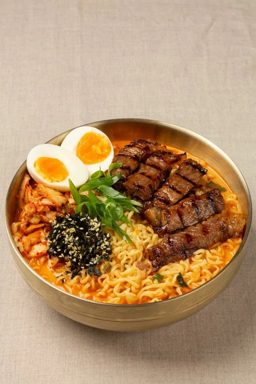 • Джин-рамен на говяжьем бульоне с мраморной говядиной BBQ и жареным кимчи. Блюдо — гастрономическая ирония по-корейски: в него добавили быстрорастворимую пшеничную лапшу.