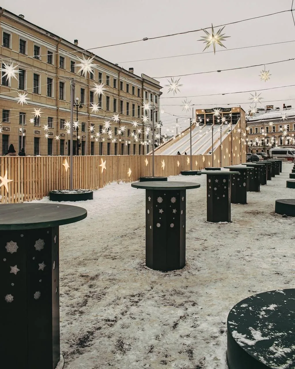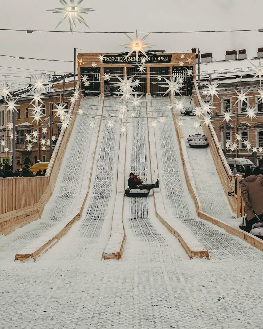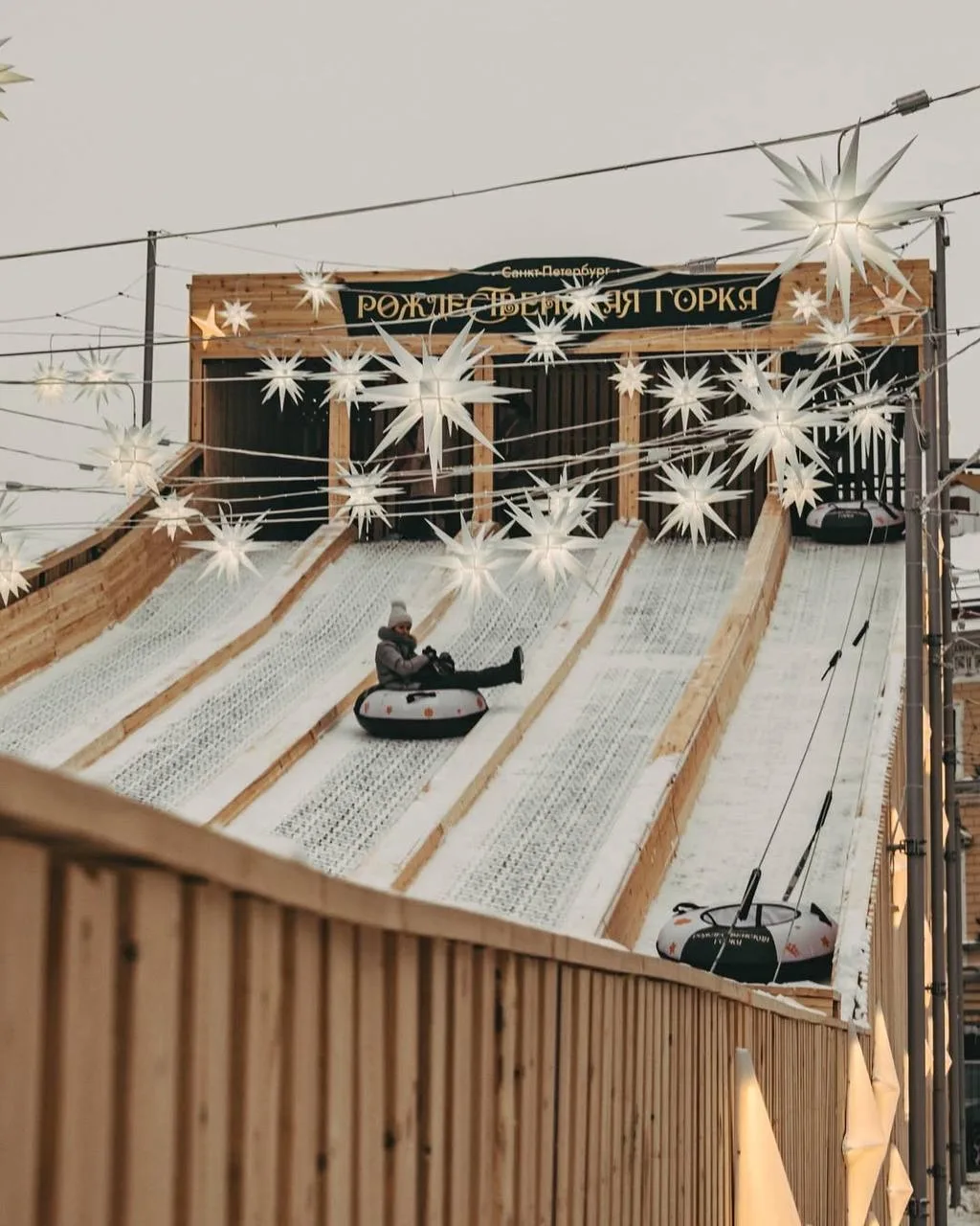 Здесь есть ледяные дорожки, фудтраки и горка — прям маленький зимний парк развлечений.