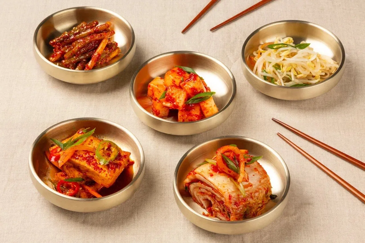 • Новый панчан-сет: пять традиционных южнокорейских закусок: ростки маша в заправке из кунжута, остро-сладкая черемша, фреш-кимчи, обжаренный тофу с зеленым луком и белая маринованная редька.