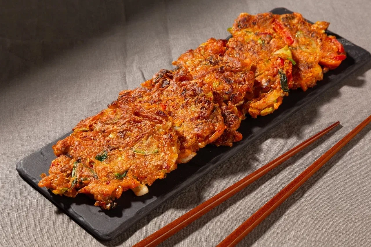 • Блинчики паджон из рисового теста с кимчи, морковью, кабачками и шампиньонами.