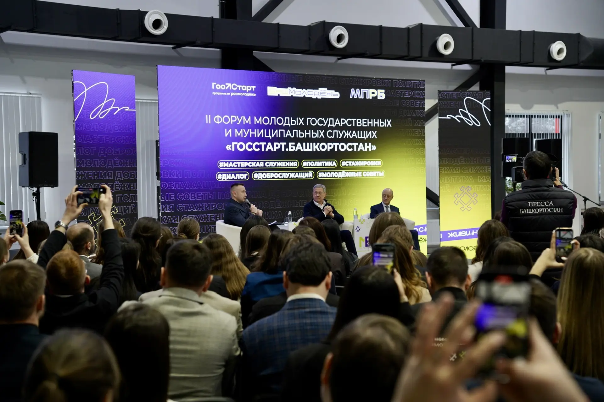 На встрече с почётными гостями форума, Главой Республики Башкортостан Радием Фаритовичем Хабировым и заместителем председателя Государственной Думы Федерального Собрания России Александром Михайловичем Бабаковым, ребята открыто обсудили вопросы внедрения в работу искусственного интеллекта, престиж профессии госслужащего сегодня, профессиональные стажировки и площадки по набору опыта и многое другое.