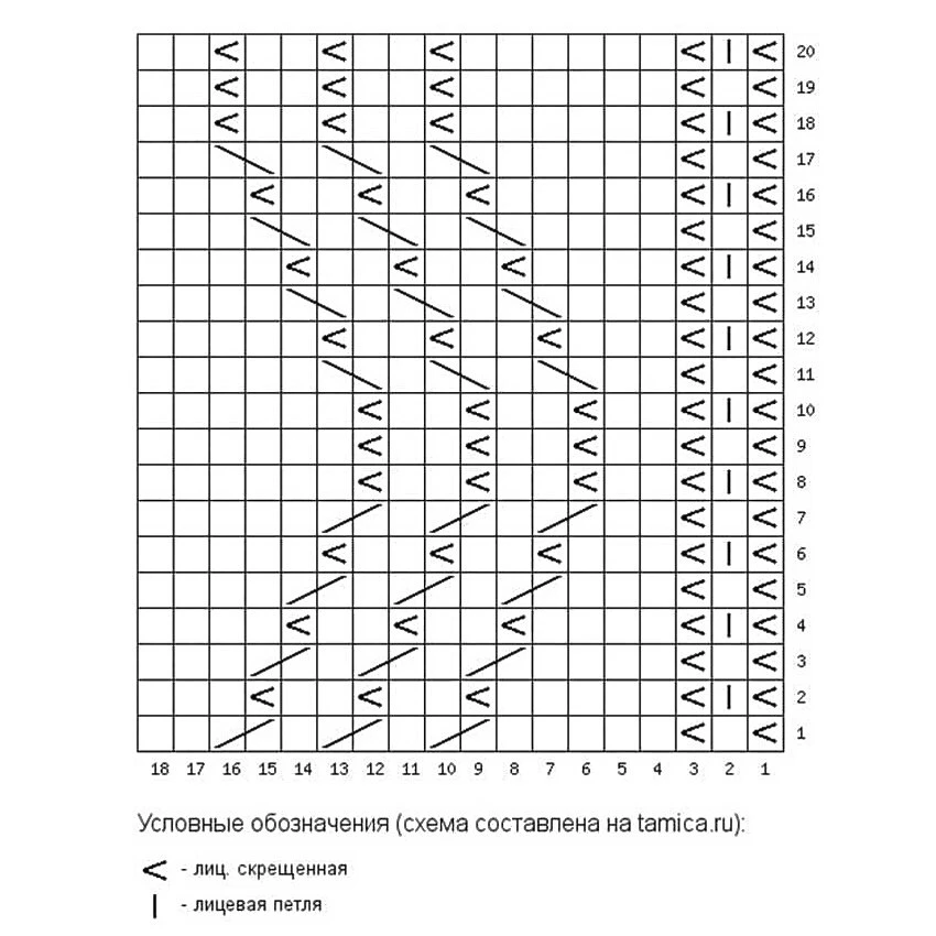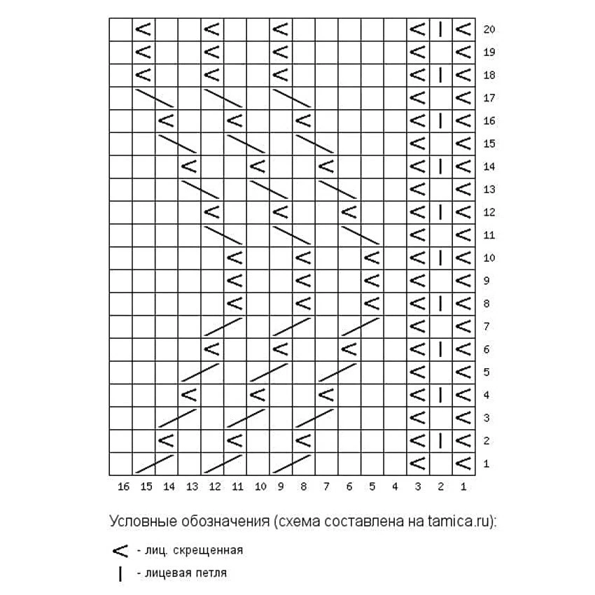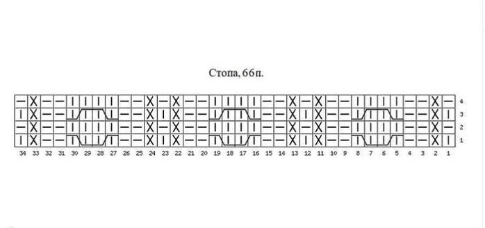 🔵Далее вяжем паголенок по схеме (2,5 раппорта = 12 мм). В 1, 3, 5, 7 рядах делаются перекрещивания 2-х петель вправо (лицевая скрещенная). В 11, 13, 15, 17 рядах - перекрещивание 2-х петель влево.