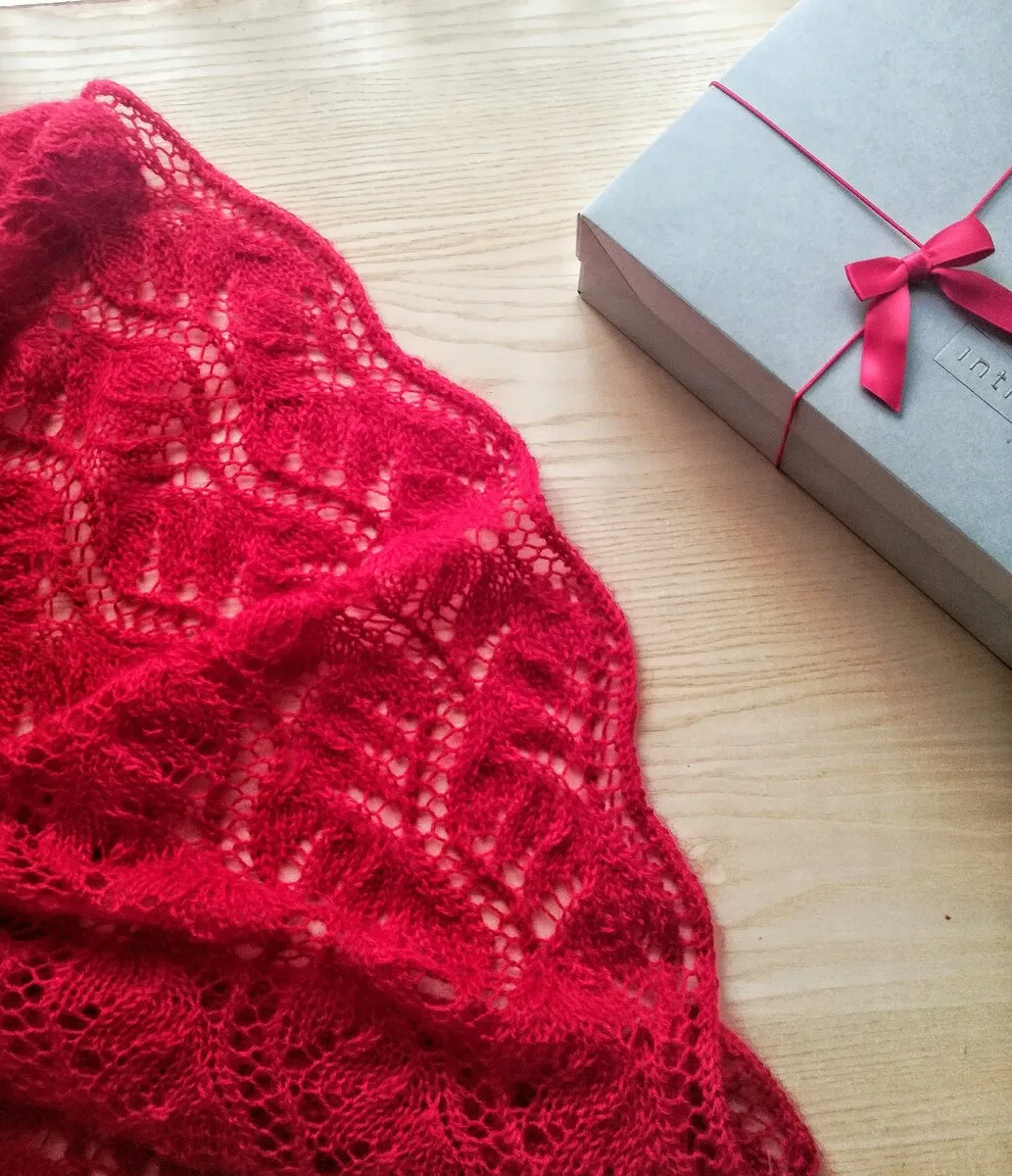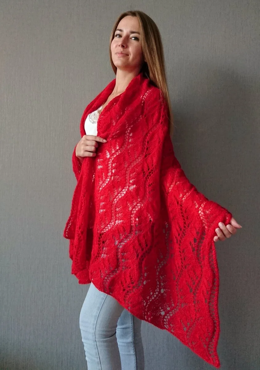 Красный ажурный палантин спицами - схема.Схема палантина называется "Все реки текут".