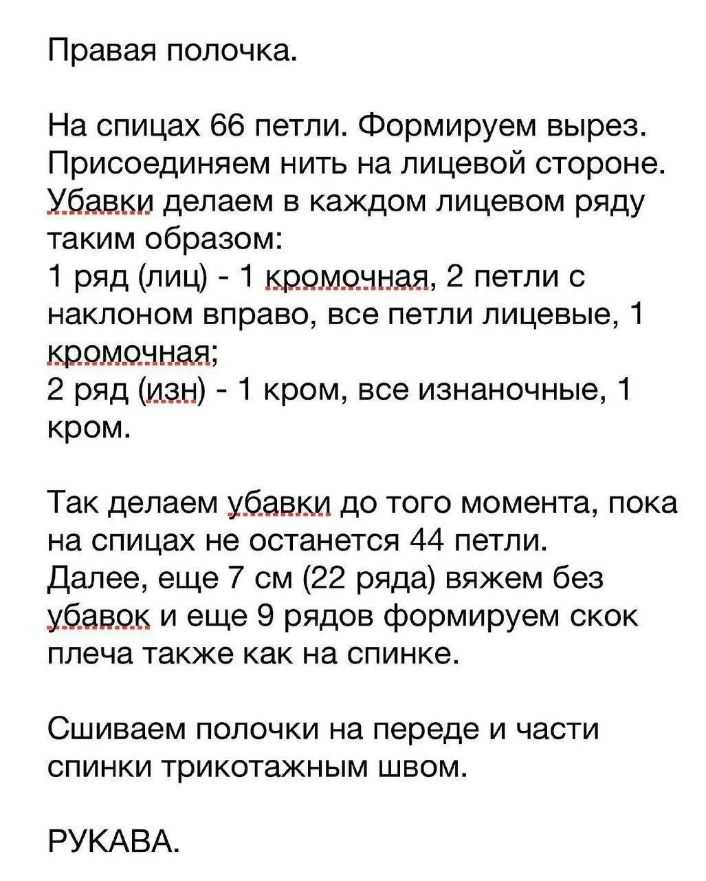 Провязываем 66 петель правой полочки, затем 132 петли спинки, доходим до 66 петель левой полочки ее мы НЕ ПРОВЯЗЫВАЕМ и с этого момента вяжем только спинку.
