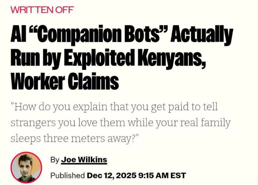 Австралийская ИИ-компания оказалась колл-центром в Кении — вместо нейросети с клиентами переписывались реальные люди. Один из сотрудников New Media Services рассказал, что работал «текстовым оператором» и от лица трёх–пяти вымышленных персонажей вёл романтические и интимные переписки с одинокими американцами, которые верили, что общаются с ИИ-девушками. За сообщение ему платили 5 центов, а главной задачей было добиться, чтобы клиент продлил подписку. Экономика - Подписаться