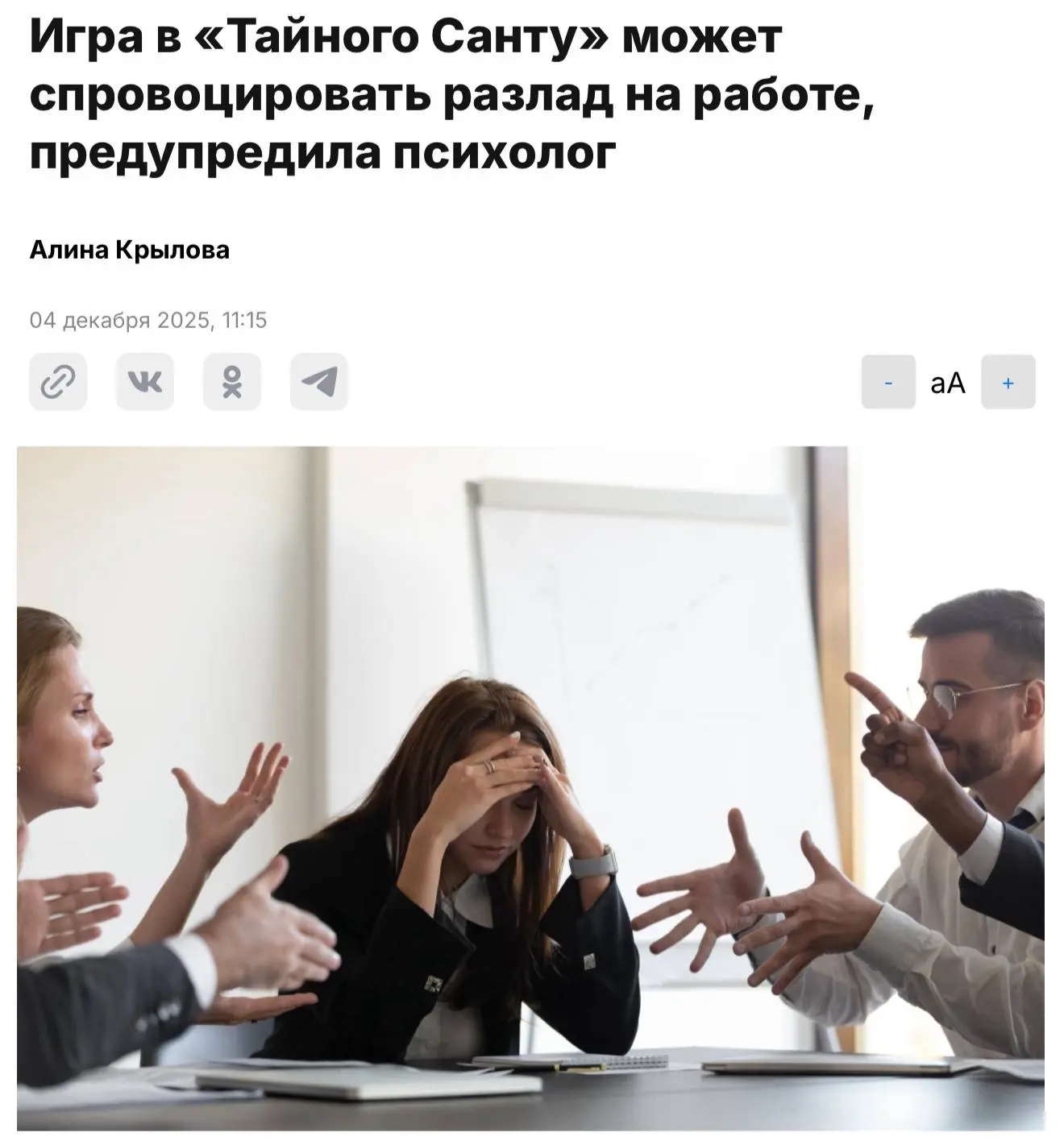 Психологи предупреждают: «Тайный Санта» может поссорить коллег/ Эксперты отмечают, что офисная игра в «Тайного Санту» нередко вызывает напряжение, тревогу и обиды. В рабочей среде, где люди связаны только деловыми отношениями, подобные «подарочные эксперименты» часто воспринимаются как вторжение в личные границы. Даже установленный ценовой лимит не спасает: одни стараются и выбирают подарок с душой, другие — лишь «для галочки», что может задеть самооценку и испортить атмосферу в коллективе. Экономика - Подписаться