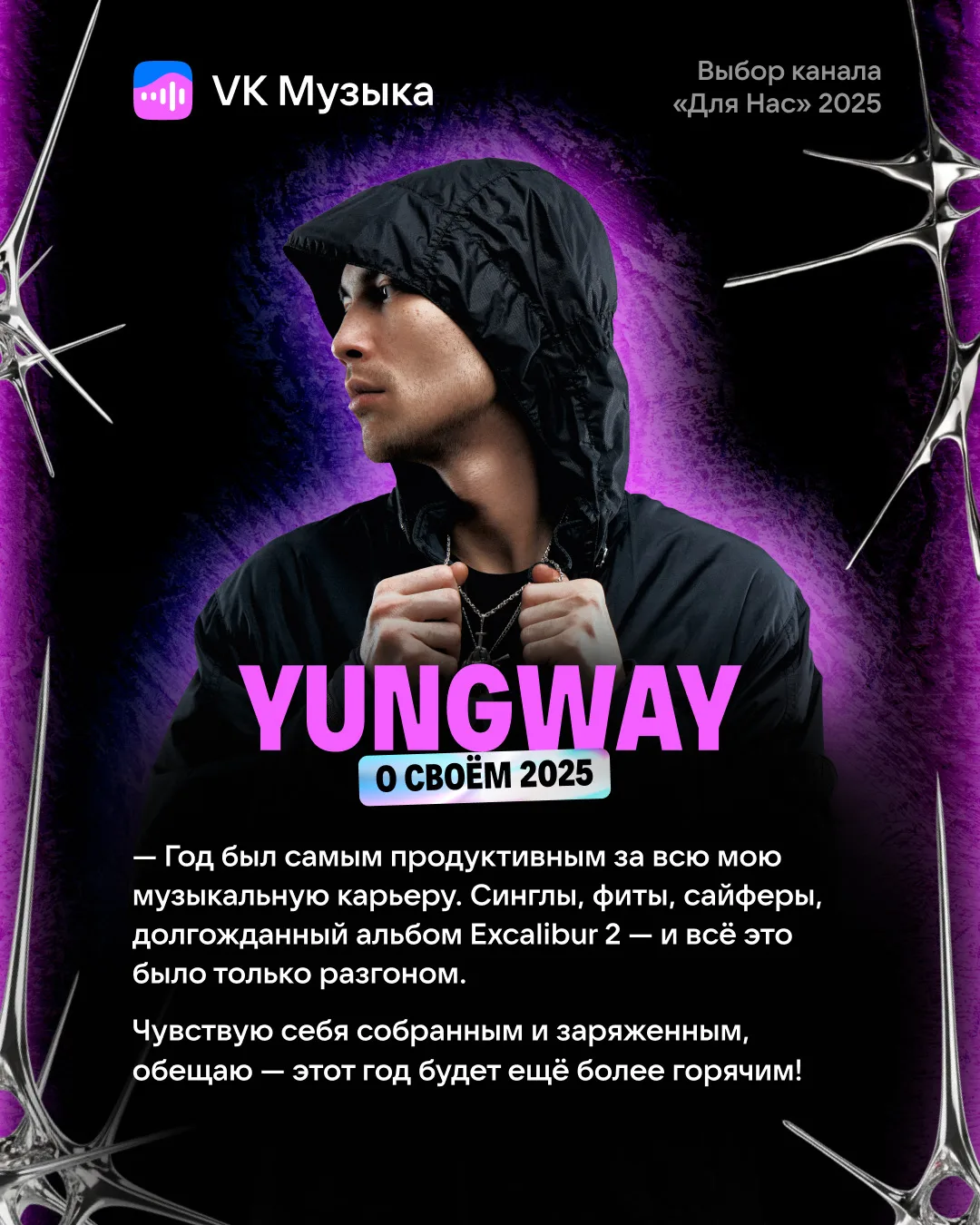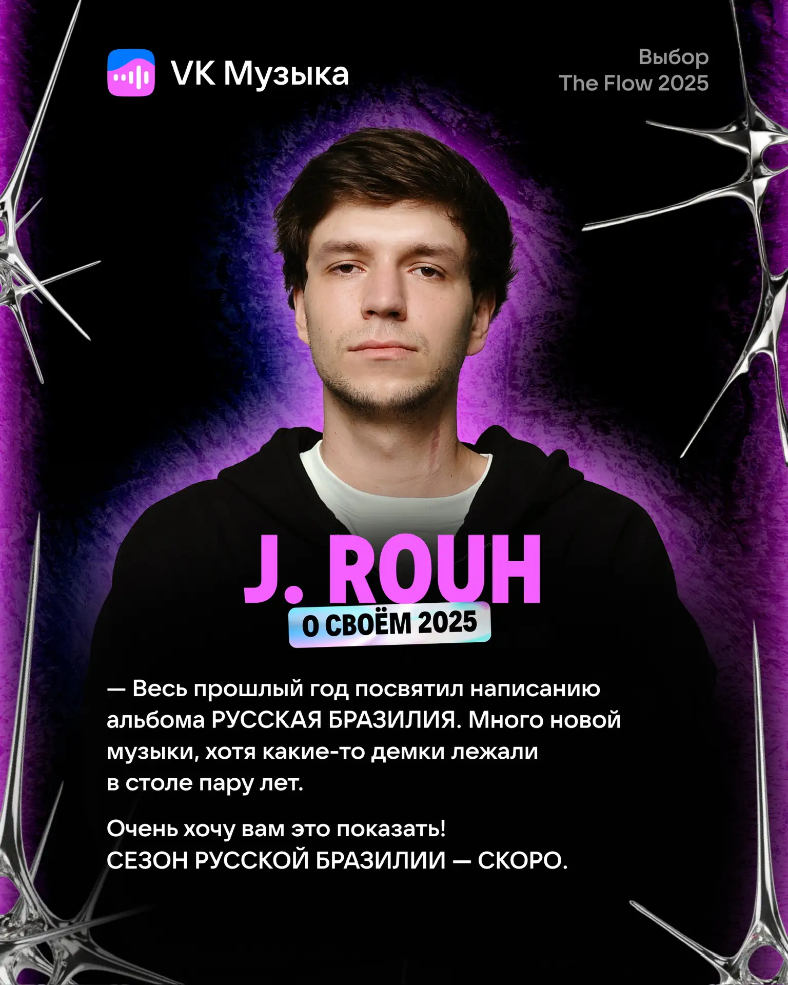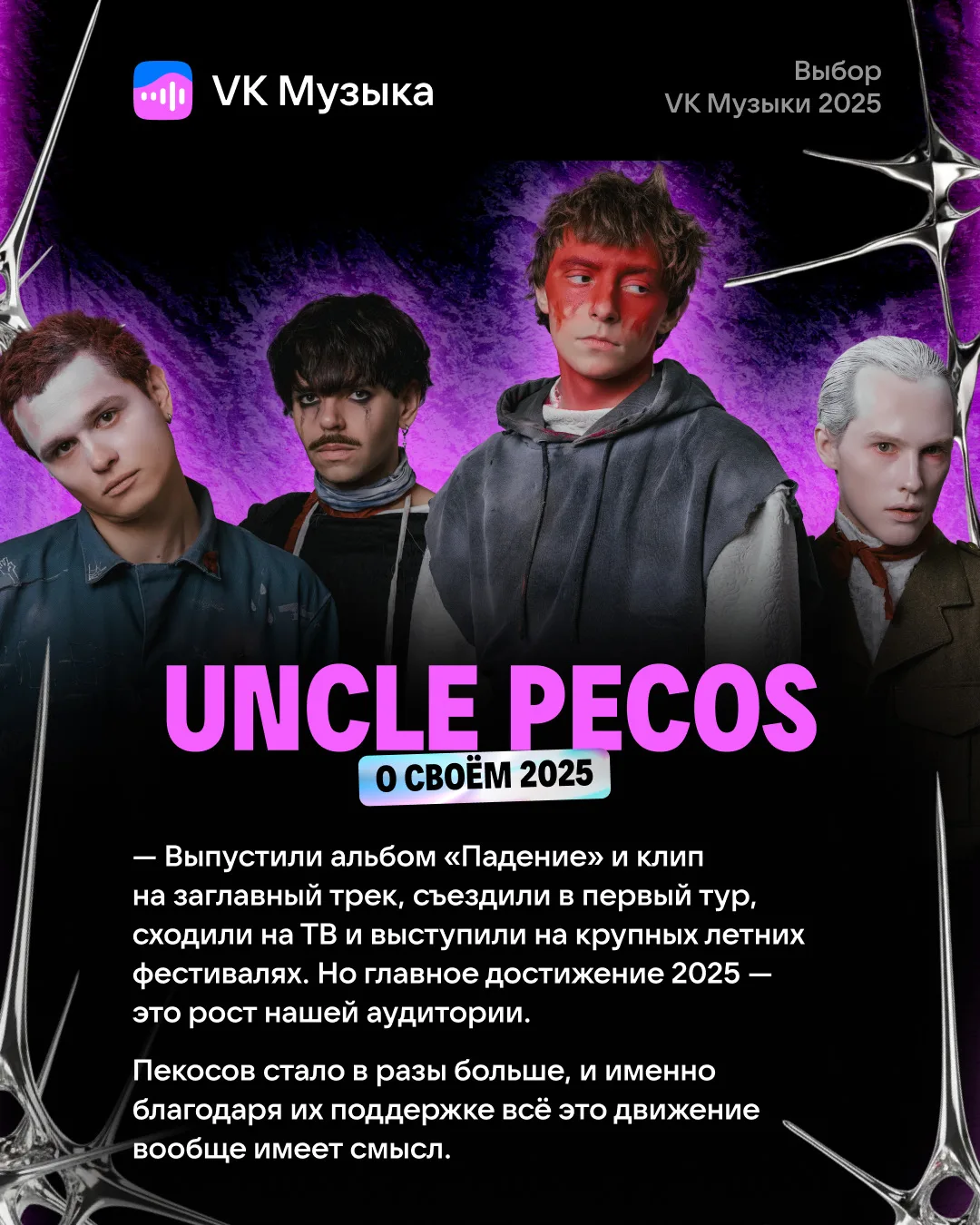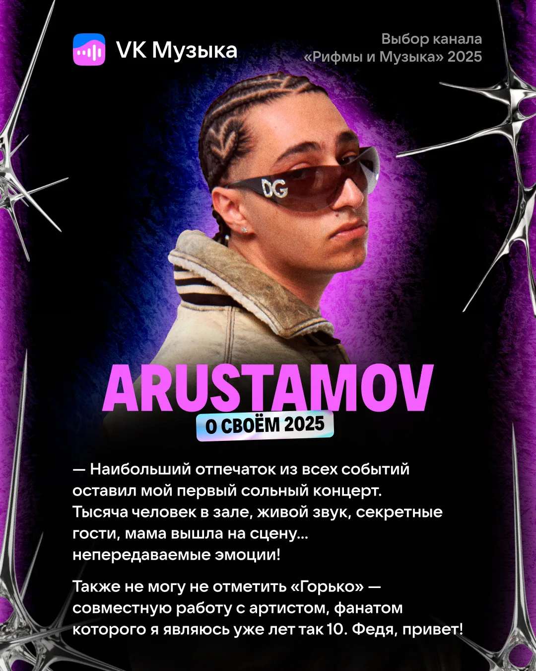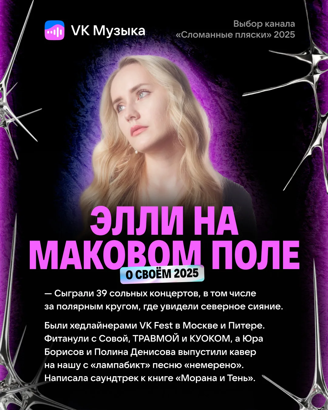 Продолжаем узнавать итоги артистов, которые ярко проявили себя в 2025. Читайте в карточках истории Маугли, A$THMA BOYS, J. ROUH, Элли на маковом поле, Rozalia, uncle pecos, ARUSTAMOV и YUNGWAY 🤩
