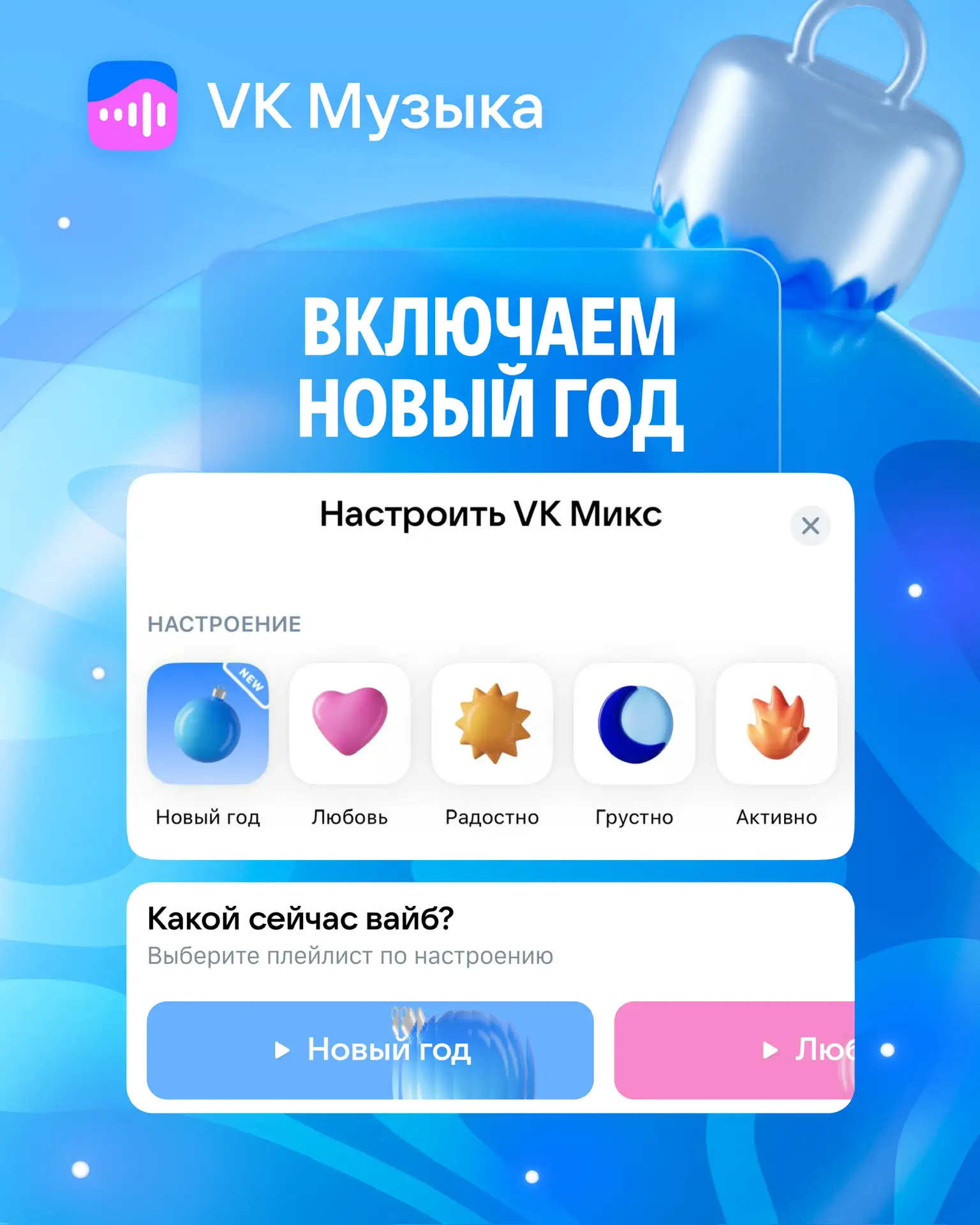 Жмите «Новый год» и слушайте подборку треков, которые передают атмосферу праздника и совпадают с вашим музыкальным вкусом. Вайб «Новый год» появился как в отдельном приложении VK Музыки, так и в музыкальном разделе ВКонтакте.
