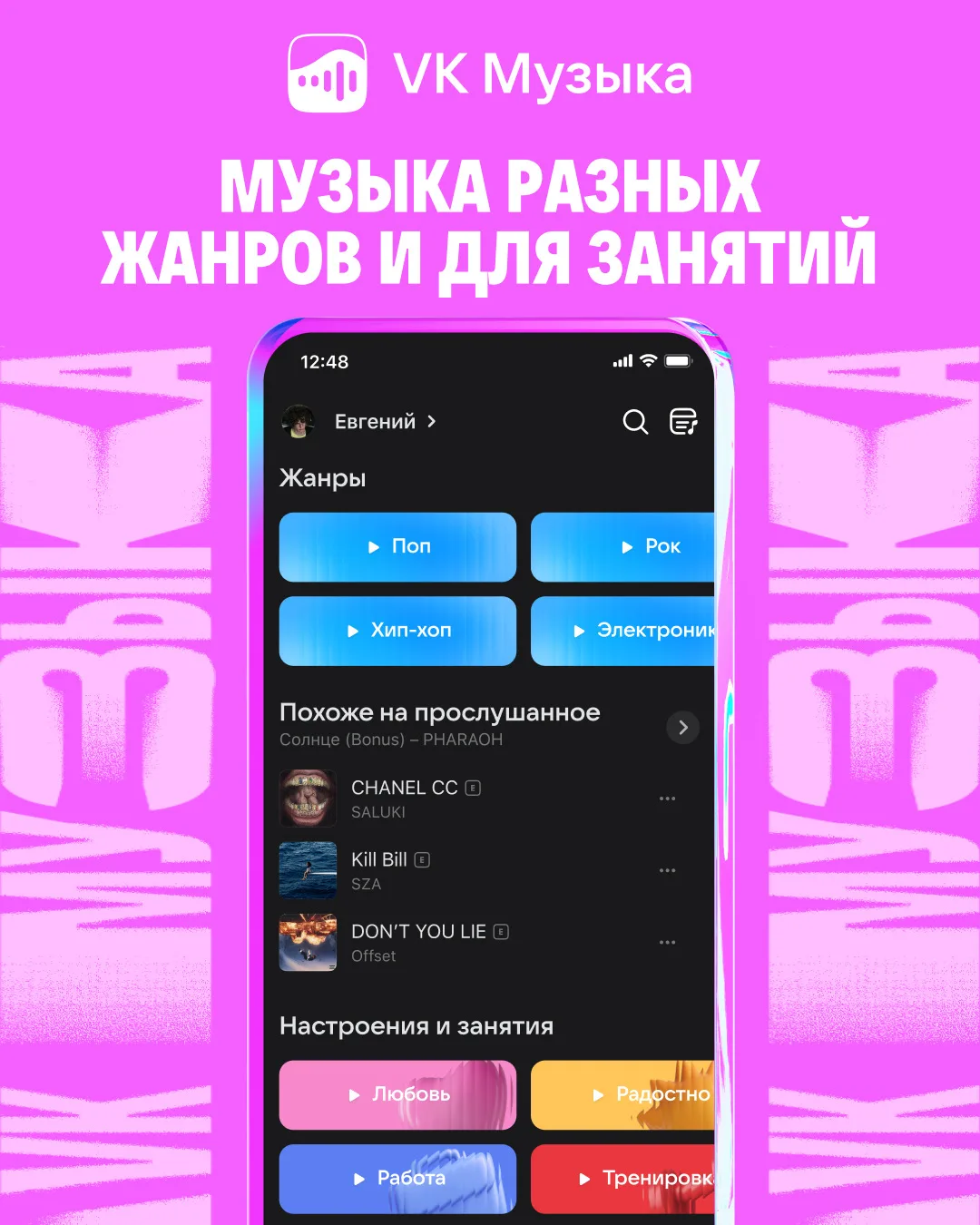 🎧 В блоке «Настроения и занятия» включайте музыку под конкретный момент дня: работа, тренировка, игры, вечеринка, утро или вечер.