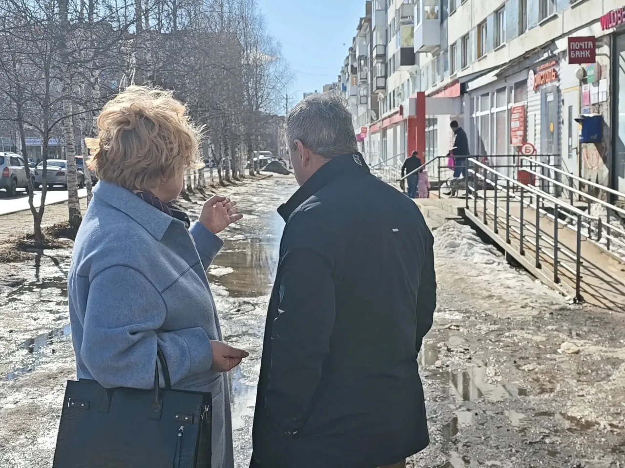 Особую озабоченность у руководства города вызывает состояние тротуаров на Комсомольской площади, прилегающих к торговым объектам. Эта проблема неоднократно поднималась жителями Ухты. В связи с этим, Марина Метелёва дала распоряжение предприятию «Ухтаспецавтодор» обеспечить организованный отвод воды с указанной территории.