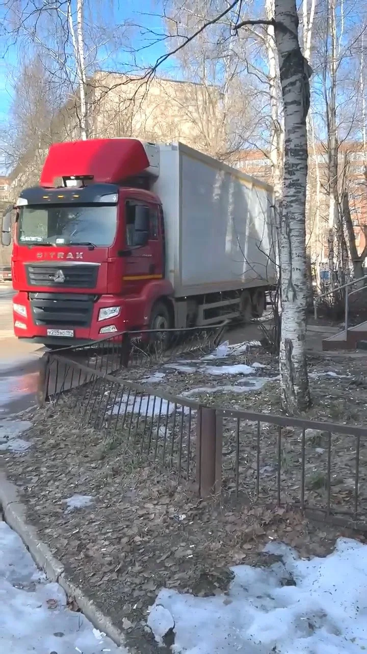 По двору ездят грузовики, доставляющие товары в магазины «Магнит» и «Магнит Косметик». Дорога для них слишком узкая, водители заезжают на бордюр. При выезде с территории дома на проезд Строителей у водителей нет обзора слева — зеркал или светофора не предусмотрено.