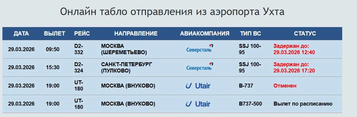 По данным онлайн-табло аэропорта Ухты, рейс в Москву (Шереметьево) на 9:50 перенесен на 12:40. Вылет в Санкт-Петербург вместо 15:30 состоится в 17:30. Оба рейса выполняет «Северсталь».